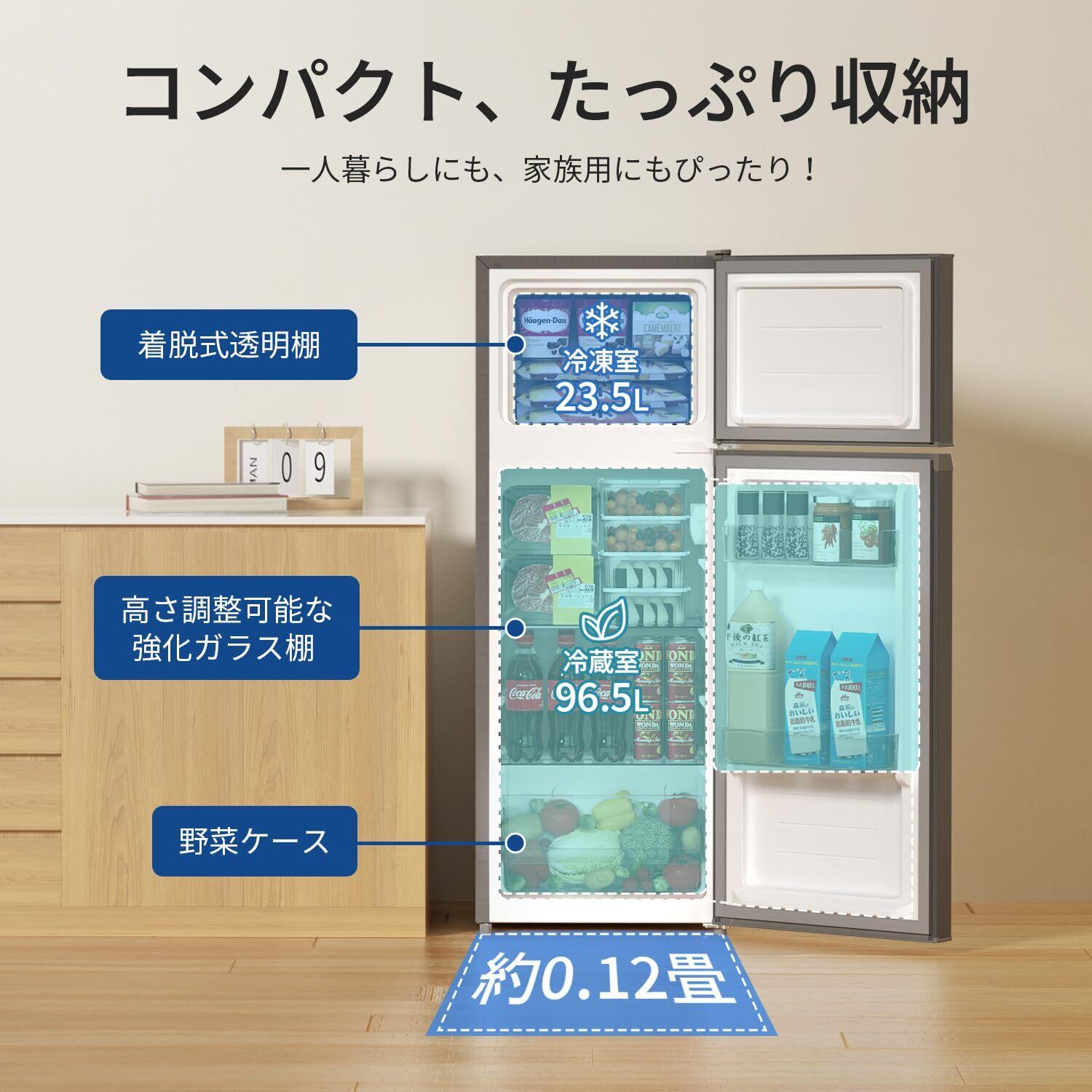 【120Lの大容量で多用途に対応】外寸はコンパクトながら、冷蔵96.5L + 冷凍23.5Lの実用的レイアウト!冷蔵室96.5Lには飲み物ボトルや調味料、野菜、作り置きおかずがたっぷり収まり、冷凍室23.5Lではアイスクリームや冷凍食品、氷もしっかりストック可能。一人暮らしでまとめ買い・自炊派のメイン冷蔵庫としてはもちろん、キッチン・リビング・オフィス等、さまざまな設置場所で活用できます。