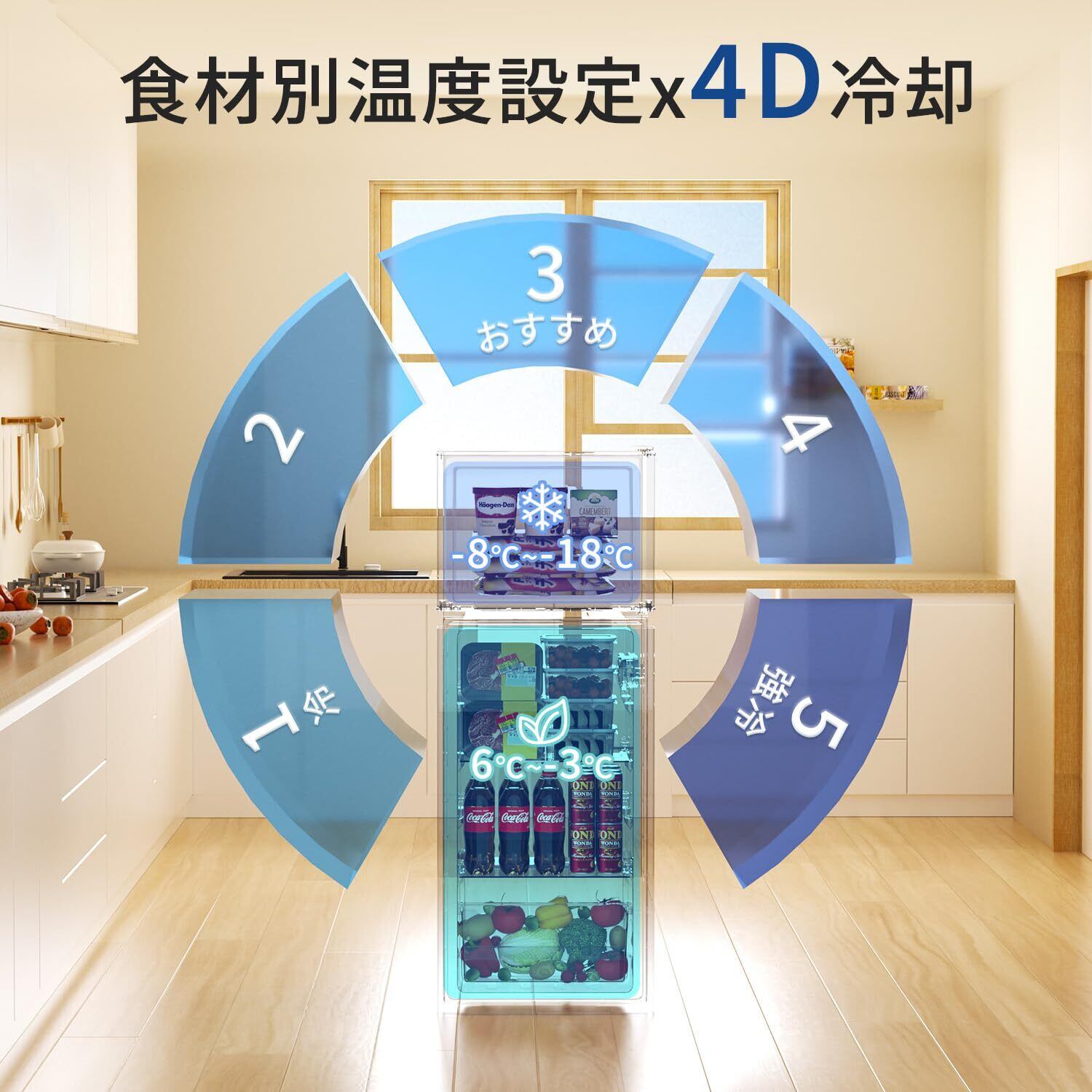 【5段階温度調節で鮮度キープ】食材に最適な環境で鮮度保持!冷蔵室(12℃〜-3℃)と冷凍室(-8℃〜-16℃)をそれぞれ独立して5段階で細かく設定可能。食材の種類や季節に合わせて最適な保存温度を簡単に選択でき、鮮度を長く保ちます。