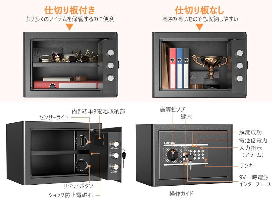 NATRKE 金庫 家庭用金庫 暗証番号 テンキー式 電子 防犯 緊急キー付き 家庭用 店舗用 保管庫 防犯箱 業務用 警報アラーム付き A4ファイル対応 床・壁に固定可能 サイレントモード 取り外し可能な棚付き LED室内照明 緊急キー付き 日本語取扱説明書付き アップグレード版