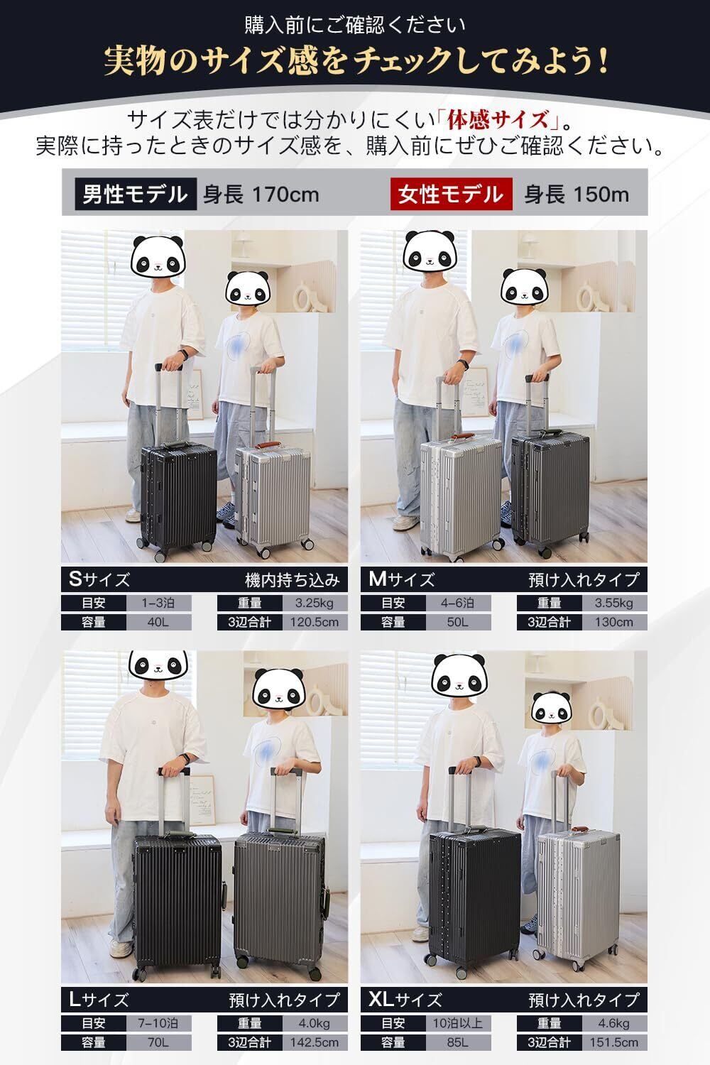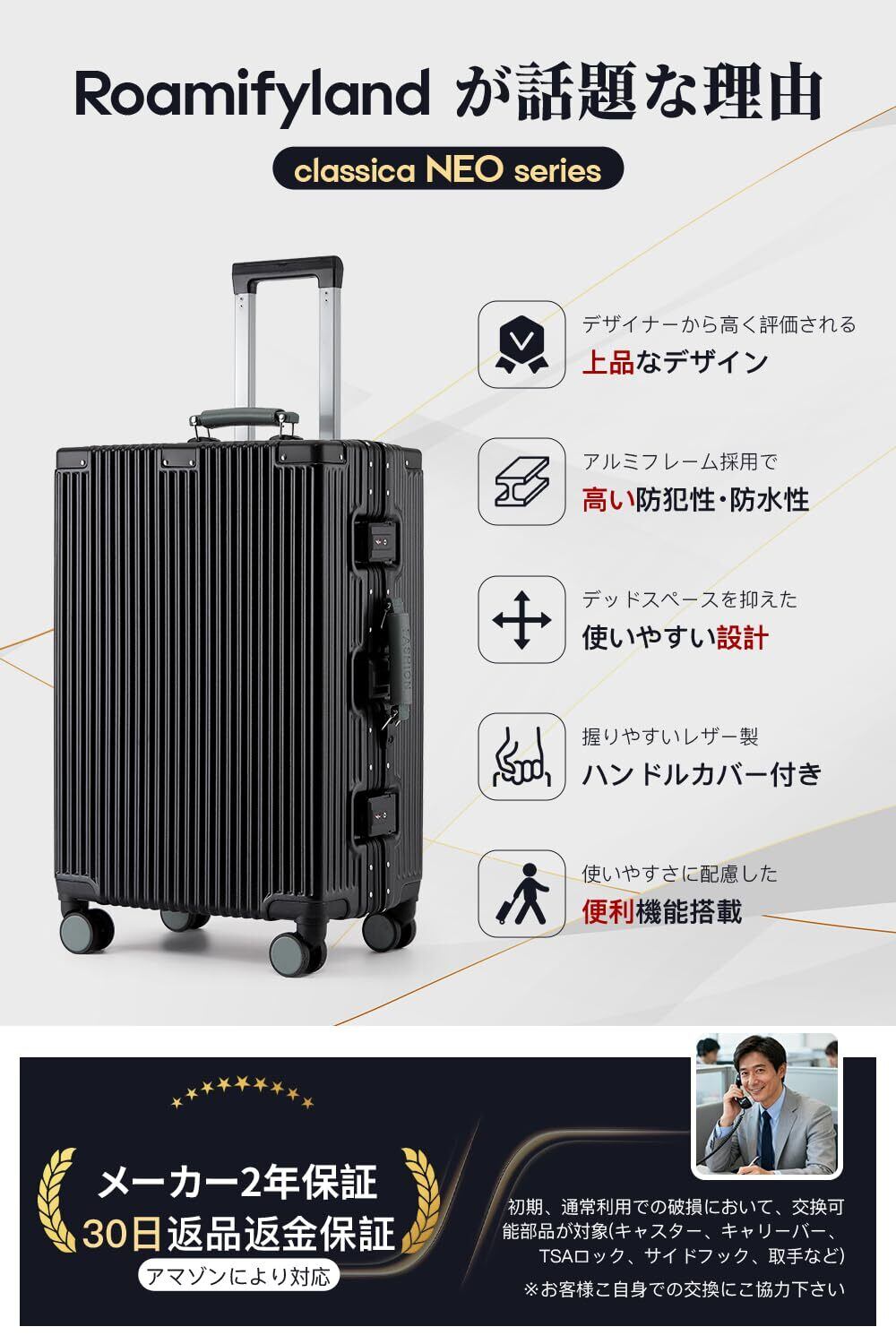 【頑丈なPC+ABS樹脂ボディ】 本体にはPC+ABS樹脂を採用し、軽さと耐久性を両立しました。アルミフレームと3点蝶番構造(LサイズとXLサイズ)により強度がさらに向上し、外部からの衝撃にも安心です。四隅にはアルミコーナーパッドを搭載しているため、空港での荷扱いや日常使用でも荷物をしっかり守ります。