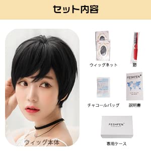 FESHFEN ウィッグ ショート フルウィッグ 女性ウイッグ ボブ かつら wig レディーズ 手植え 自然 耐熱 ウィッグ フリーサイズ ハロウィン ネット付き 黒