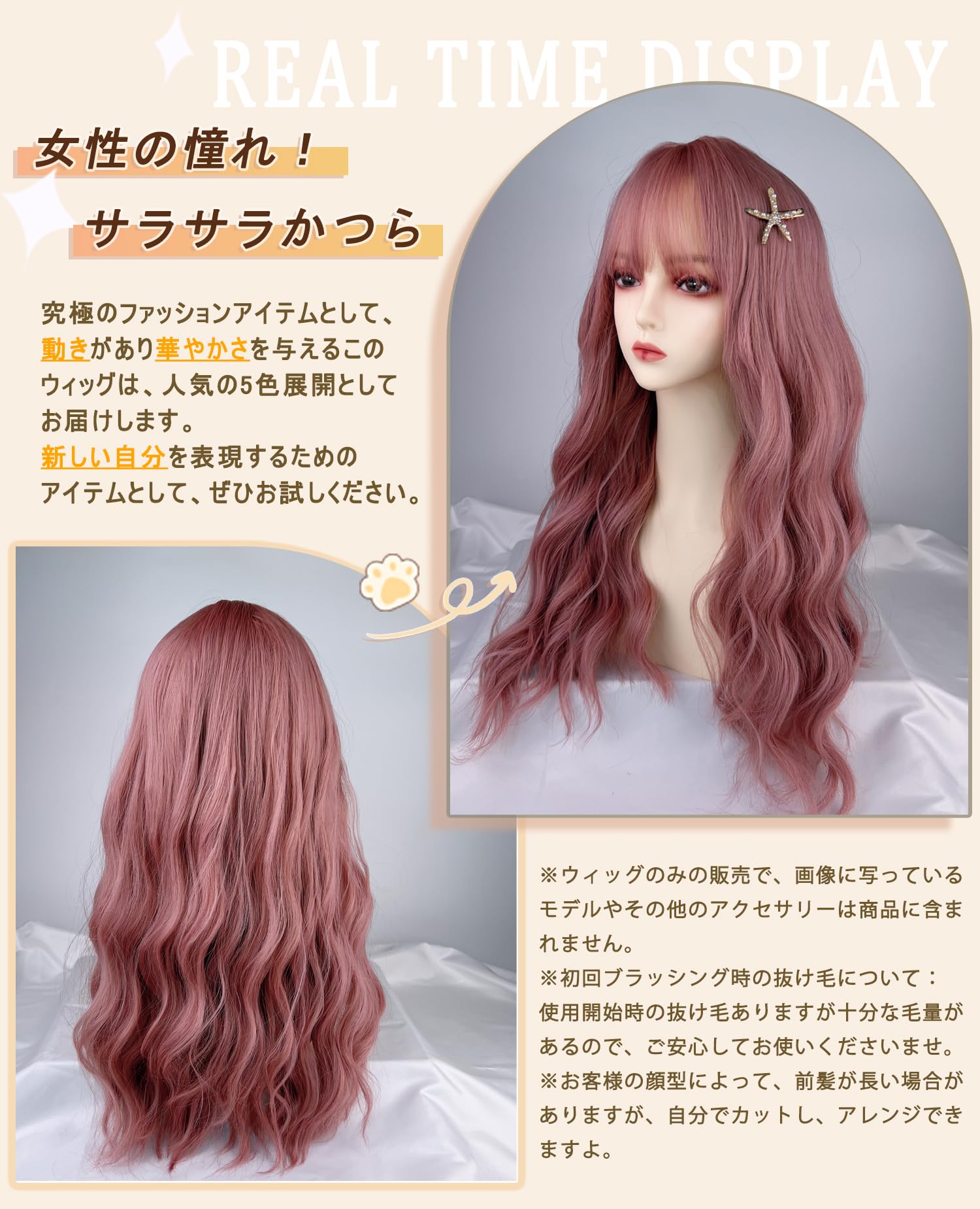 【アフターサービス】商品やサービスに関するお問い合わせはいつでも歓迎です。お客様一人ひとりに最適な製品体験を提供するため努めています。【ご注意】①使い始め一番最初のブラッシングの際、抜け毛はありますが十分な毛量で仕上げていますので、ご安心してお使いくださいませ。②写真と実物の色がPCやスマホ画面の見え具合によって若干異なる場合がございます。予めご了承ください。③ウィッグのみの販売で、画像に写っているモデルやその他のアクセサリーは商品に含まれません。
