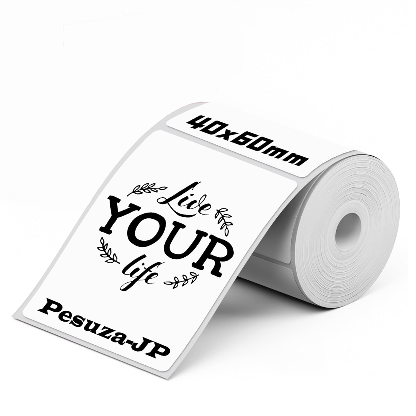 「用紙規格」40x60mm、角丸、白ベース、黒文字、230枚/ロール、Pesuzaの感熱紙はM110 M120 M220対応