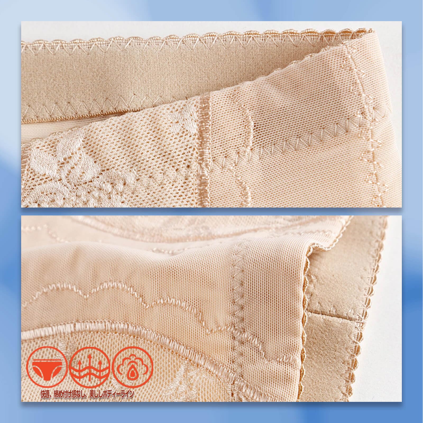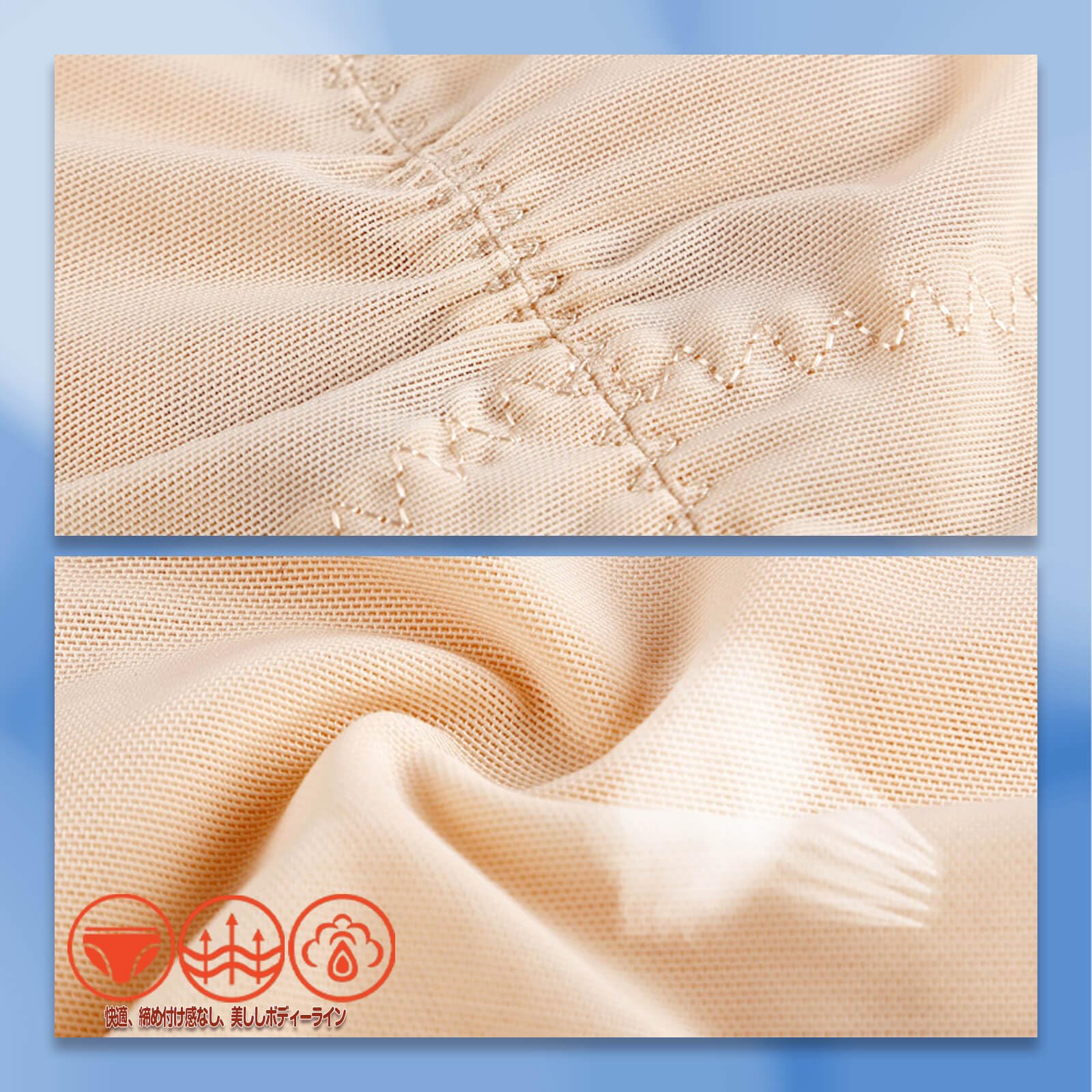 【肌触りの良い素材、年間で使える】心地よい肌触り感、通気性、伸縮性も抜群です。クロッチ部分は肌に優しい綿素材で、季節とかかわらずに年間適しています。長く着用でも変形難い補正ショーツです。