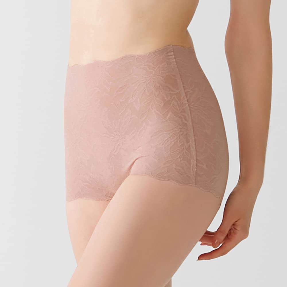 生地端にゴムがないカットオフストレッチレースで肌への圧迫は少なく、お腹周りとヒップラインをしっかりカバー。 ヒップ下に段差が出来にくく、痩せ見え効果あり。