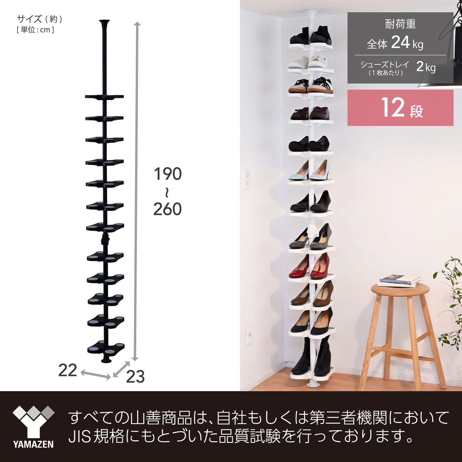 山善(YAMAZEN) 突っ張り ラック シューズラック 12段 スリム 玄関 靴 収納 省スペース 実用新案取得済 ワンタッチ突っ張り 幅22×奥行23×高さ190-260cm 棚 ディスプレイ 一人暮し 組立品 マットホワイト WJ-322RM(MWH)