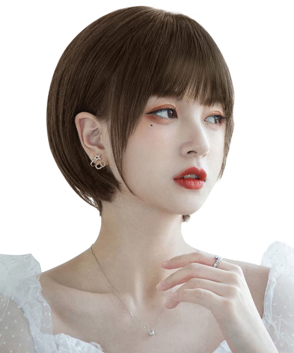 AISIHAIRウィッグ ショートボブ ぱっつん前髪 ストレート フルウィッグ レディーズ 女装 自然 耐熱 普段使い ネット/櫛付 栗茶色
