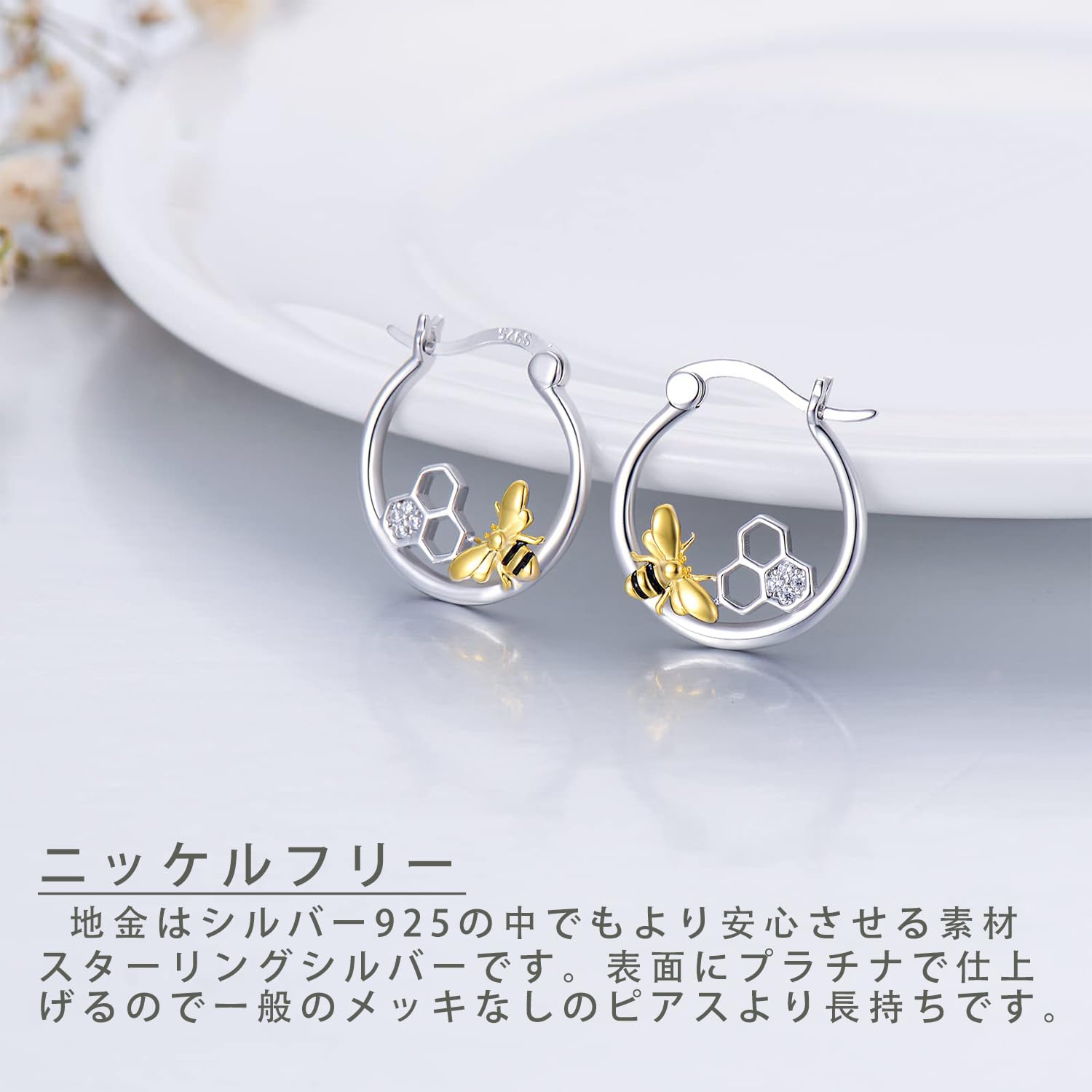【金属アレルギー対応&メッキ】レディースピアスは金属アレルギーを起こしにくいスターリングシルバーで作り上げた細工です(シルバー925の刻印あり)。金属アレルギーをお持ちの方も安心に付けるため、アレルギーを起こしやすいニッケルや鉛などを含まないです。更に、表面に変色防止のプラチナのメッキを施すので一般のメッキなしのシルバーピアスより長持ちです。
