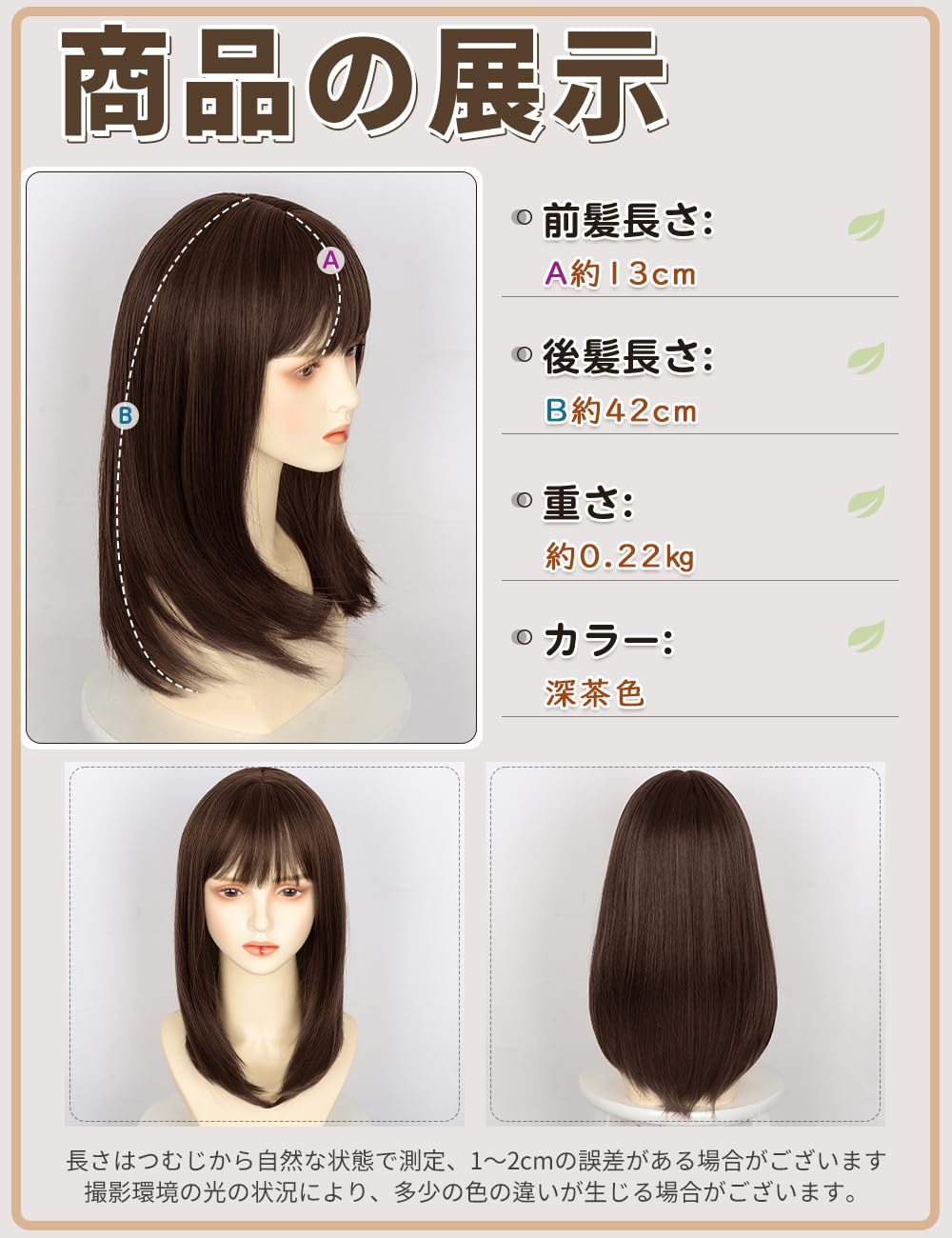 【ご注意】: ①カラー:ご使用のパソコンのモニター設定や部屋の照明により、実際の商品と若干色味が異なる場合があります。②前髪:それぞれの人に合った長さにデザインされており、好みに合わせてカットすることができます。③ケア:静電気や絡まる場合は柔軟剤やトリートメントでケアすれば大丈夫です。