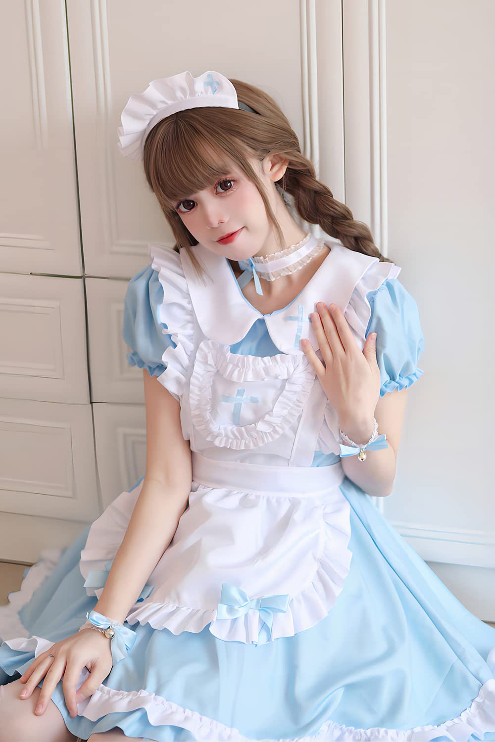 【8点セット】:カチューシャ/ワンピース/エプロン/ブレスレット*2/脚ループ*2/ニーハイソックス。