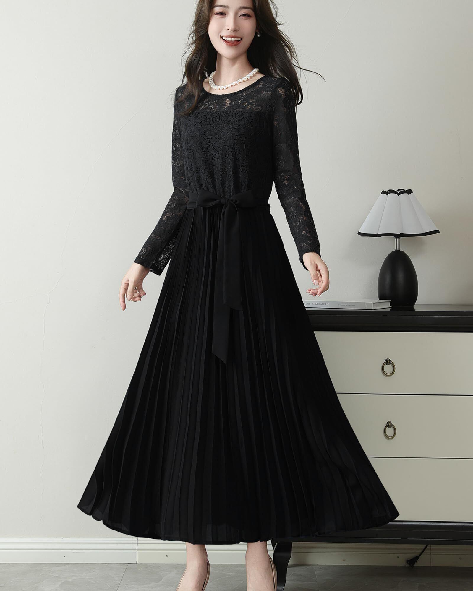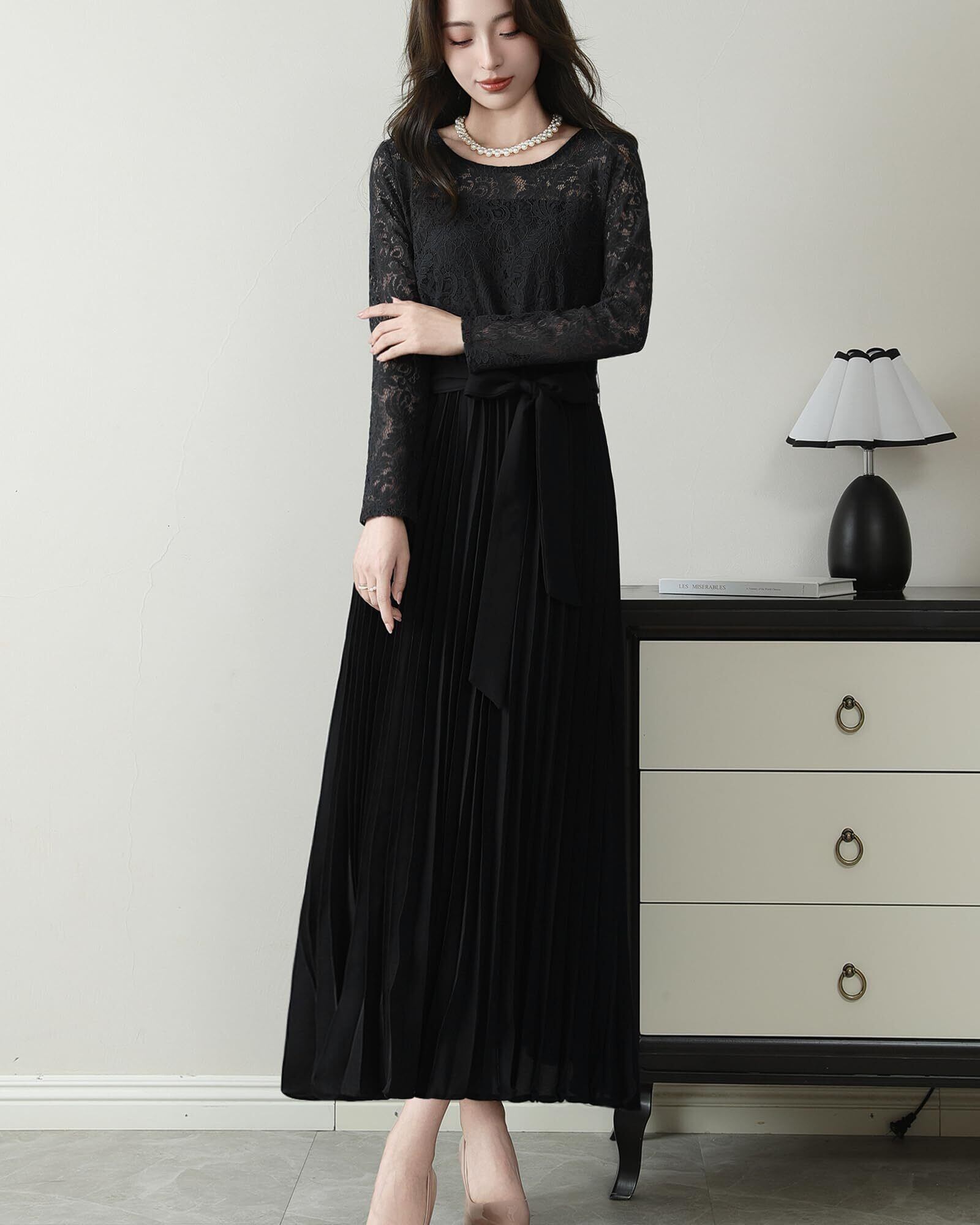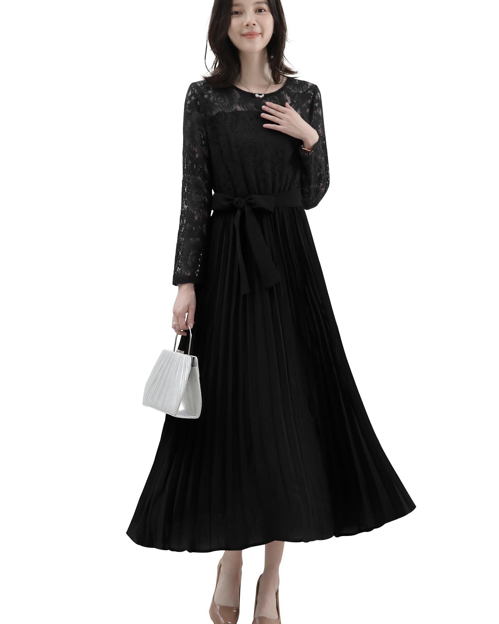 [Yino] パーティードレス ワンピース ドレス レディース レース プリーツ 切り替え 長袖 ベルト 裏地 着痩せ ロング丈 女性らしい 可愛い フォーマル 結婚式 二次会 披露宴 お呼ばれ 秋 春