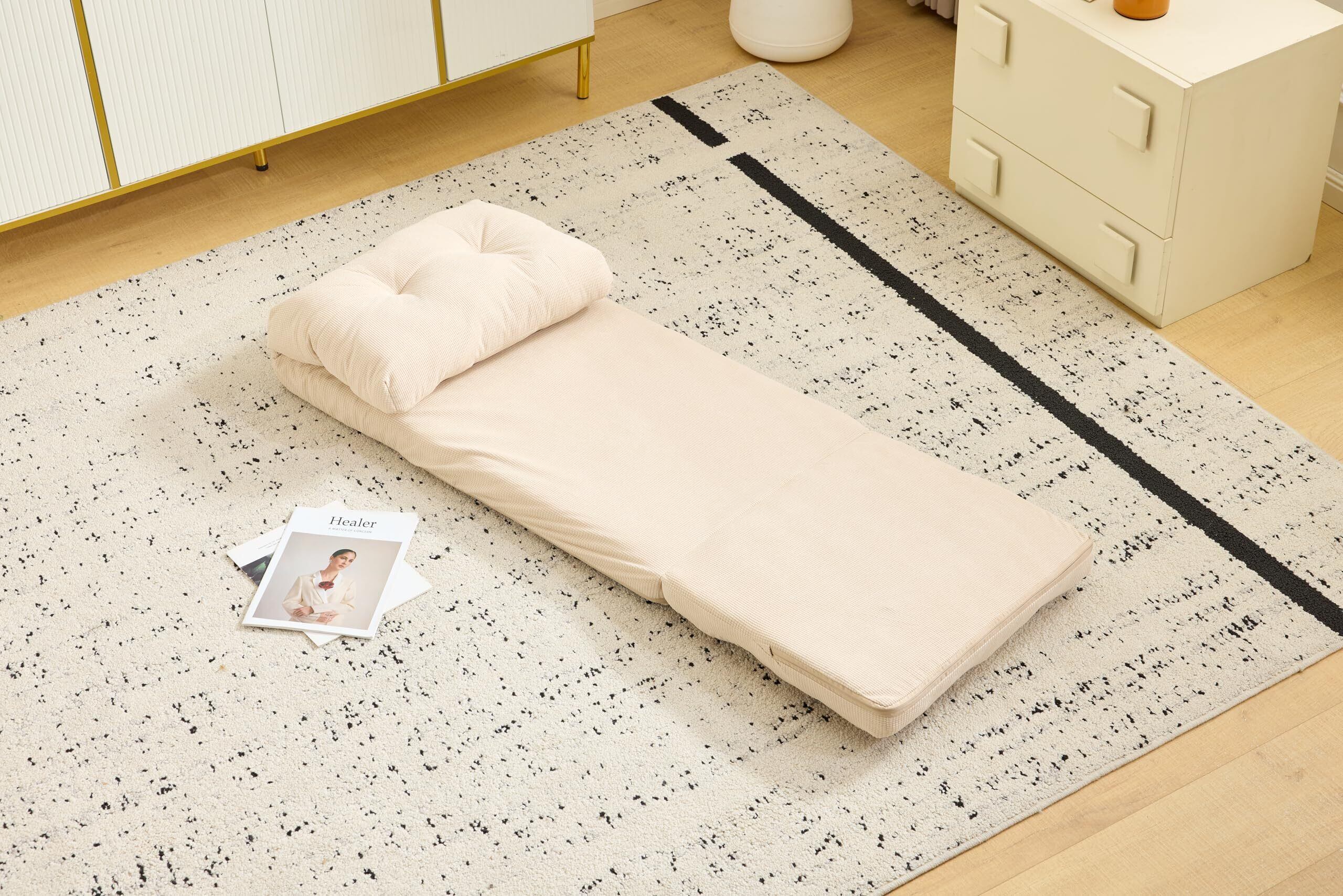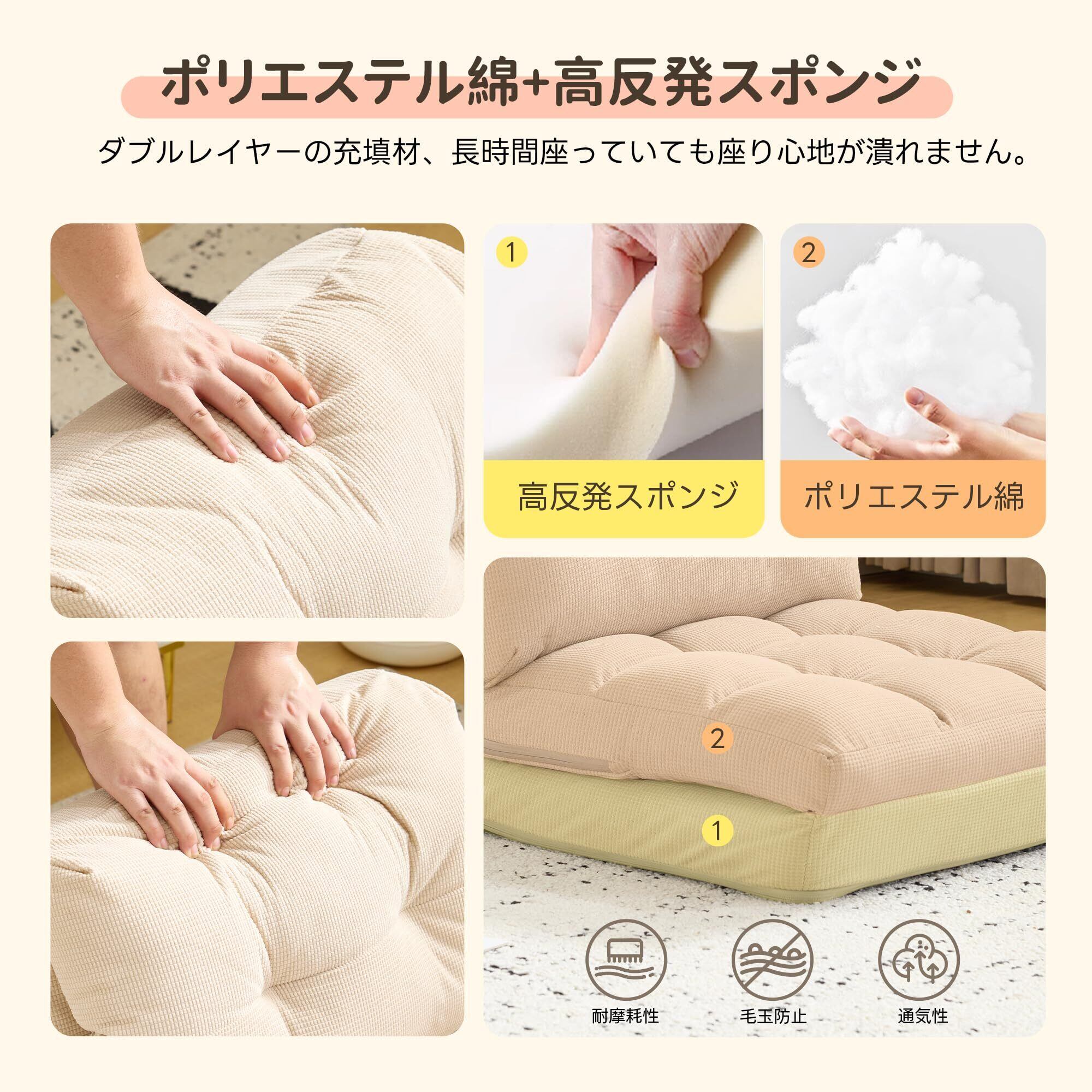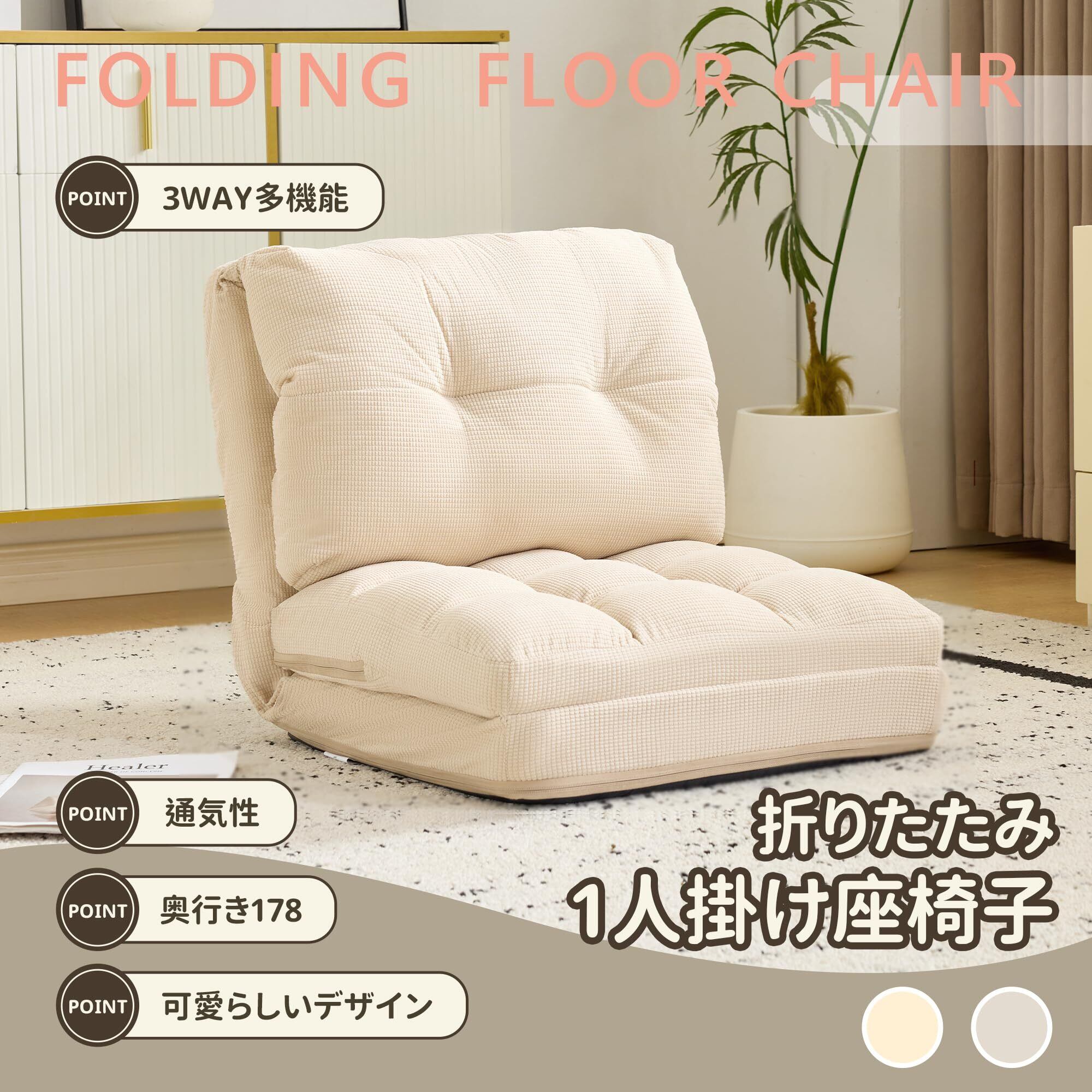 【多機能で使い勝手の良さ】ニーズに合わせて形を変えられ、快適な座椅子として使用できるだけでなく、最大 178CM のベッドにも広げられます。座る、横になるといった様々なシーンのニーズに応え、実用性に優れています。特に小さな部屋の空間に最適で、座椅子からベッドへの機能変換を実現します。 【優れた座り心地|ふかふかクッション】ふっくらとした詰め物素材を採用し、表面の触感が柔らかく、座る時も横になる時も非常に快適です。体に良いサポートを提供し、長時間使用しても疲れにくいです。 【サイズの使い勝手】座椅子の形の時は寸法がコンパクト(幅 50CM、高さ 48CM など)で、あまりスペースを取りません。ベッドに広げた時は十分な長さがあり、多くの人の体のサイズに合い、使用シーンも幅広いです。 【シンプルで美しい】デザイン外観はシンプルで上品で、細かいテクスチャがあり、様々なインテリアスタイルに簡単に溶け込み、空間に温かく優しい雰囲気を加えます。 【背もたれ 15 段階調整機能】背もたれには 15 段階の細かい調整ギアがあり、ほぼ垂直な座りのサポートから、だらけた半横になる角度、そしてほぼ平らに横になる休憩状態まで、それぞれの段階は心を込めてデザインされています。まっすぐ座って仕事や読書に専念する時も、リラックスしてドラマを見たり音楽を聴いたりする時も、あるいは体を完全に伸ばしてちょっと休憩したい時も、調整して自分の体のカーブと快適なニーズに最も合う角度を見つけることができ、首や背中などの部位にちょうど良いサポートを提供し、体の疲れを効果的に和らげ、様々な使用シーンでの快適な体験を的確に満たします。 【コンパクトでどこにでも置ける】このソファは非常に小さく、コンパクトです。寝室の片隅に置けば専用のくつろぎスペースに、書斎に置けば読書用の快適な座椅子に、狭いバルコニーエリアにも設置でき、気持ち良い眺めと休憩の場に変身させることができます。スペースの限られた小さな家であっても、広い空間に柔軟な小さな座るエリアを追加したい場合であっても、簡単に適合し、あまりスペースを取らず、様々なホームシーンのレイアウトにより柔軟で実用的な可能性を提供します。