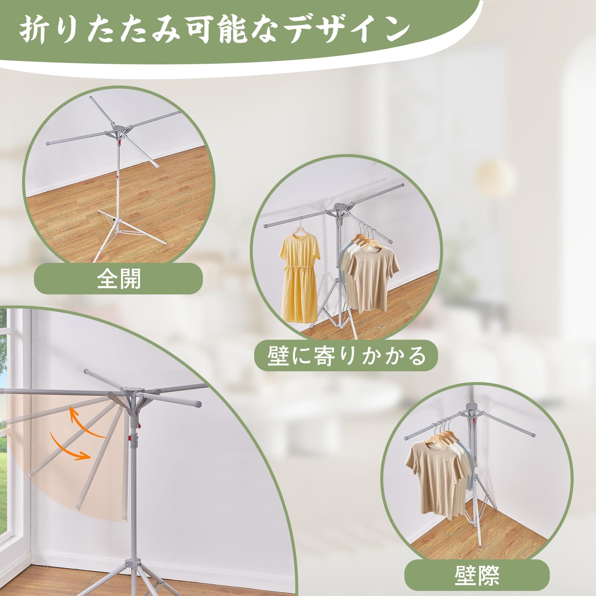 【コンパクト収納できる】この三脚乾燥ラックは折りたたみ可能なデザインで、使用しないときには簡単に折りたたんで収納できます。折りたたむと非常にコンパクトになり、家具の隙間や壁に立てかけて収納できるので、部屋のスペースを無駄にしません。特に限られた収納スペースを有効活用したい方に最適です。