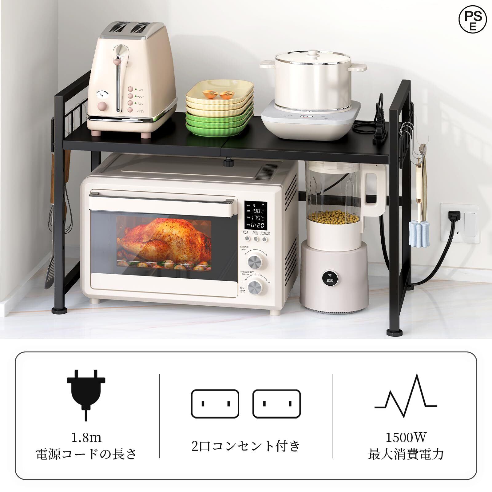 LunarLight キッチンベイカーラック 伸縮式 幅39~65奥行き32高さ42cm コンセント付き 棚板高さ6段調節可能 総耐荷重20~50kg Sフック8個付き レンジ上ラック トースターラック レンジ置き台 キッチン棚 キッチン収納 台所整理 (ブラック)