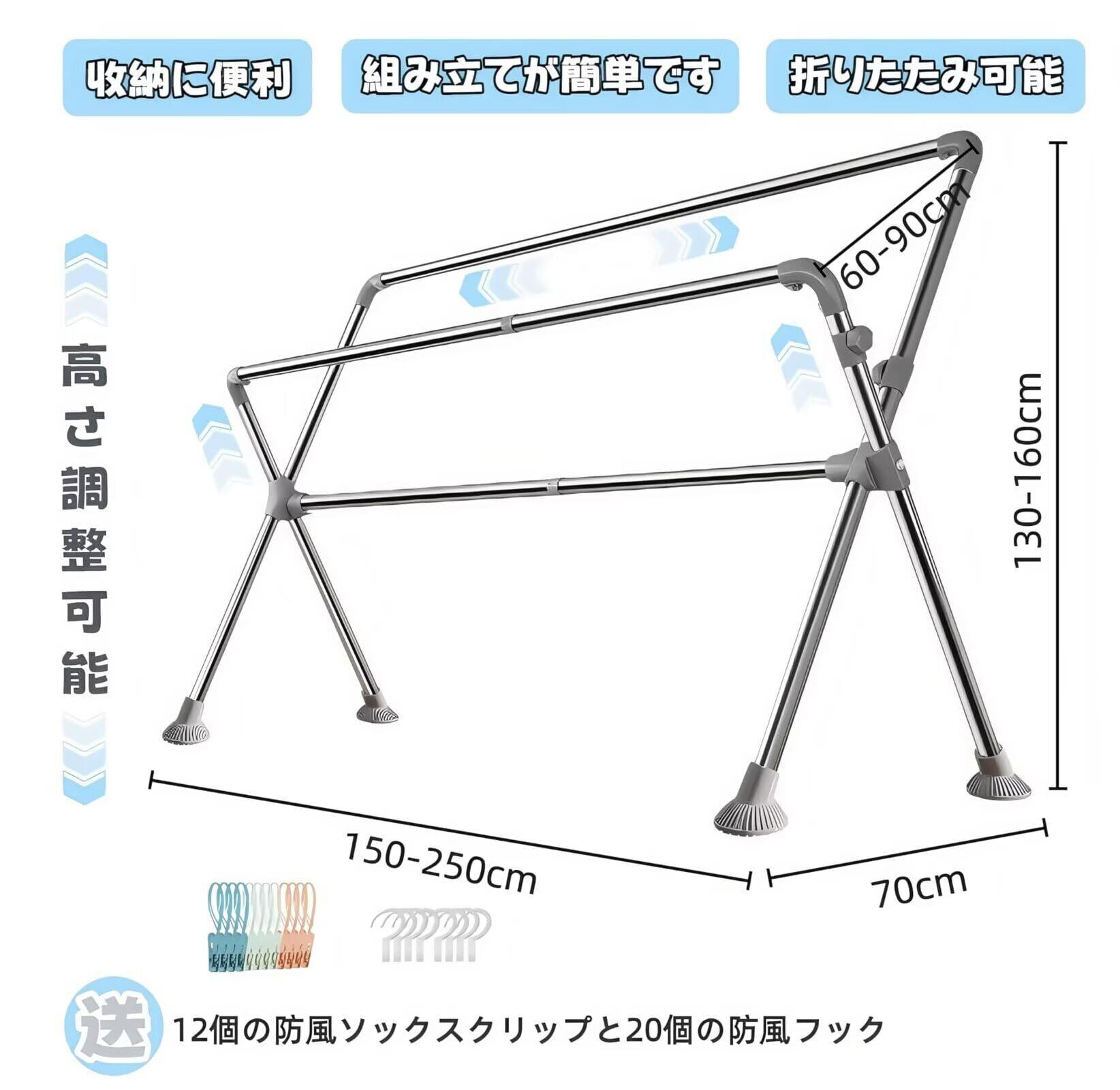 洗濯物干し 物干しスタンド X型 ステンレス鋼 長さ150-250cm 高さ130-160cm調節可能 大容量 折りたたみ 布団干し 高耐荷重 床置き式 風に強い 錆びない 多機能 省スペース 屋外室内用 日本語説明書付き(シルバー,250x71x160cm)