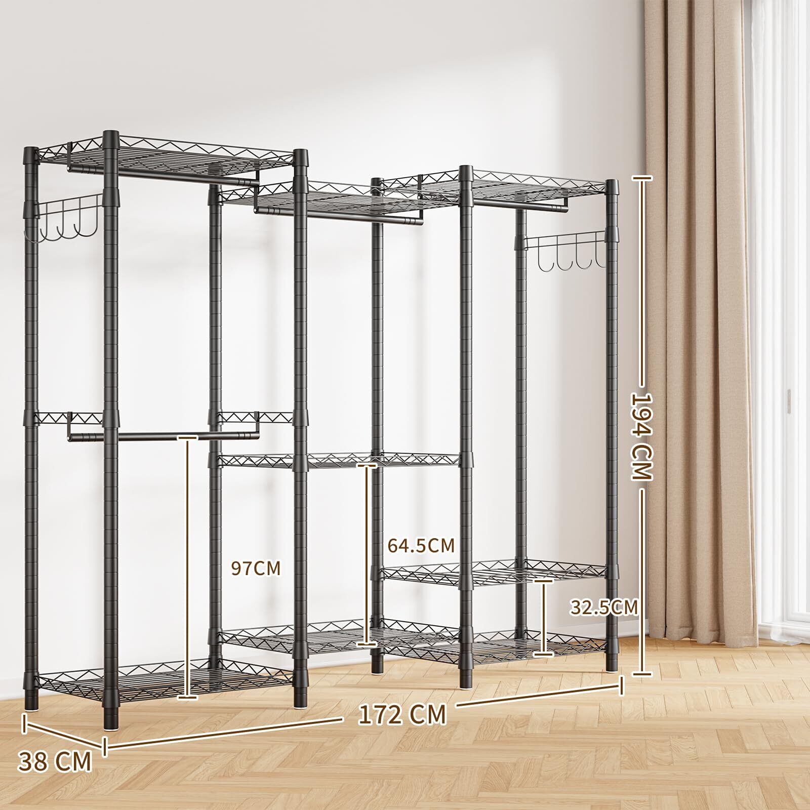 ハンガーラック 大容量:幅171.5×奥行39×高さ194cmの大型設計で、優れた防錆特性を備えています。このハンガーラック 大容量は、6段の棚、3本のハンガーロッド、2つの引き出しフックを完備し、季節の衣類から日用品まであらゆる物品をまとめて収納可能。天井部のスペースは使用頻度の低い衣類やスーツケース、布団などの大型物品の収納に最適です