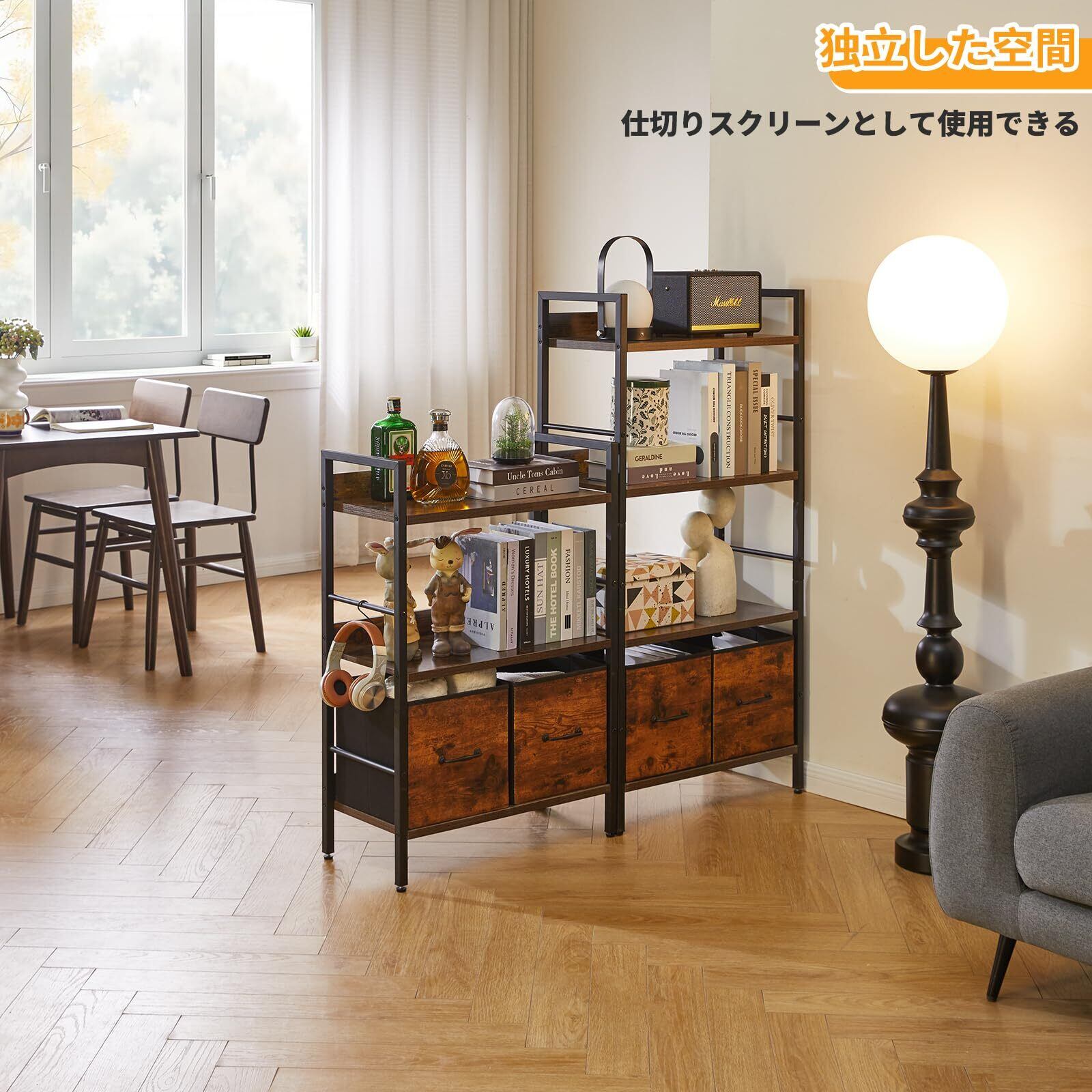本棚 収納 ラック 4段 引き出し付き 幅60奥行き30高さ123cm 棚 リビング収納 フック付き グッズ棚 植物棚 オフィス キッチンに適用 ヴィンテージ YD-BC004H