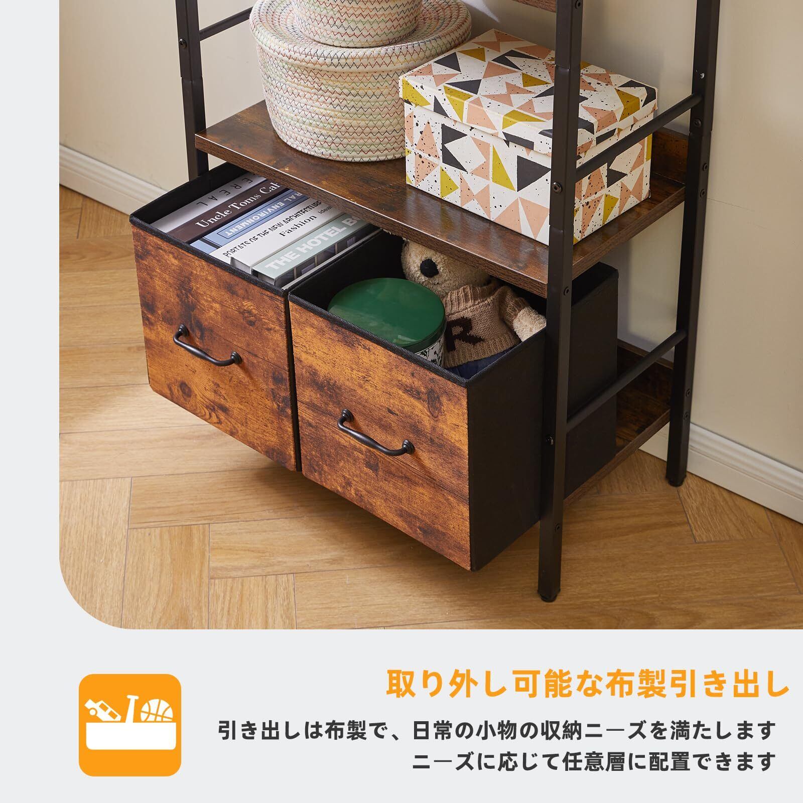使いやすい:このシェルフ棚は取り付けやすく、分解も容易で、軽量で、移動や引っ越しに便利です。布の引き出しが2つ付いていて、物を分類して収納しやすく、部屋を清潔に保つことができます。また、6つのフックが付属しており、かばん、イヤホン、鍵、皮むき器と栓抜きなどの小物を収納できます。