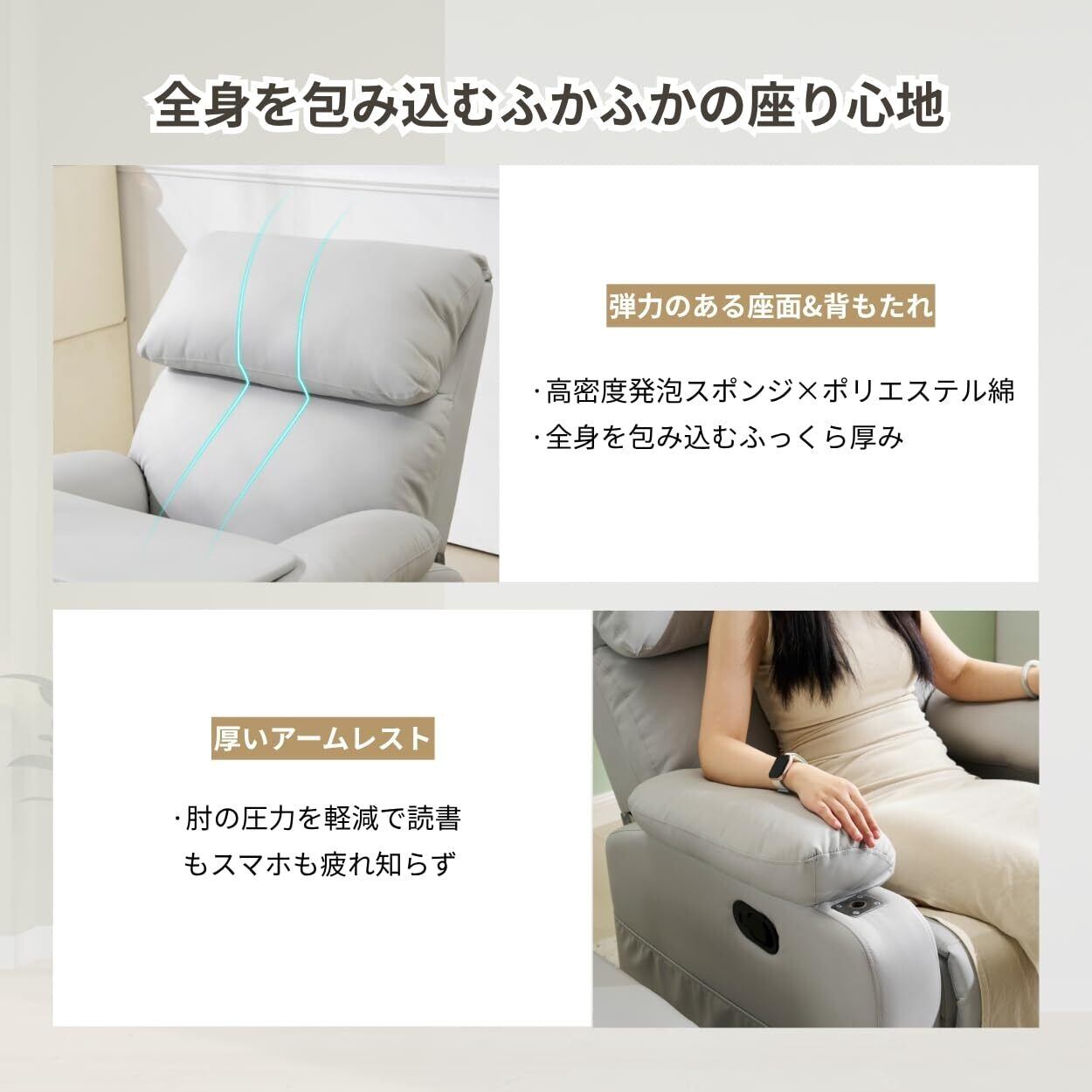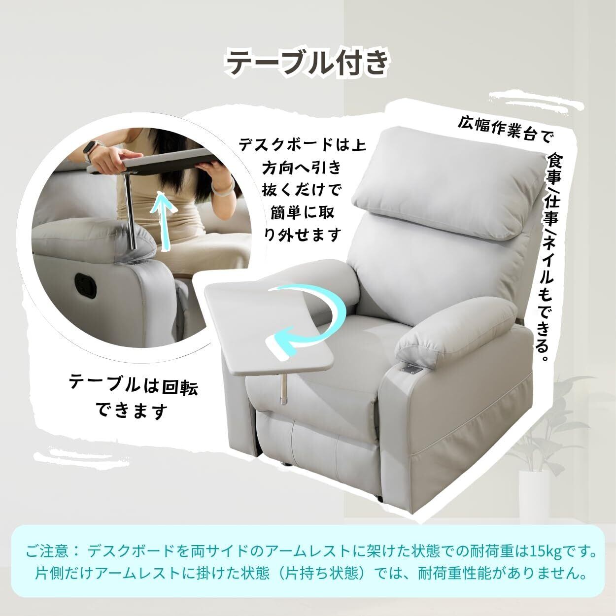 【商品仕様】・素材 生地:PUレザー クッション:ウレタンフォーム100% 構造部材:鉄 ・カラー ベージュ、グレー、ブラック ・商品サイズ 85*74*97cm ・梱包数 1 ・梱包サイズ 77*77*66cm ・重量(N.W.) 39kg ・重量(G.W.) 43kg ・生産国 中国 ・組立品/完成品 組立品 ・耐荷重 130kg" ": ◆01リクライニングソファ たっぷり詰め込まれたふわふわの綿で快適な座り心地。 思わず“沈み込む”ような、極上のリラックス空間。 高さ調整が可能な便利なテーブル付き。 ソファ耐荷重:130kg ◆02 7回転式テーブル テーブルは回転式で、用途に合わせて自由に調整可能。仕事や読書、テレビ鑑賞など、シーンに応じて快適にお使いいただけます。" "◆03座る、寝る、楽しくになる 座面 体にフィットするよう設計された座面は、自然に下へ沈み込む構造で、快適さと人体工学に基づいたサポートを両立します。 背もたれ 背もたれはまるでふっくらとしたパンのような形状で、柔らかく体を包み込みます。 フットレスト フットレストをしっかり支えることで、全身がリラックスできる構造です。 このような座り心地の良さを実現しているのは、使用している素材がしっかりしているからです。 PP綿がしっかりとした支えを提供し、コットンが柔らかな座り心地を実現。2つの素材を絶妙に組み合わせることで、快適さとサポート力を両立させた理想的な座り心地を生み出します。 座面の通気性を高める優れたSパネルパンチングと高い弾力性が特徴のコイルばねを含まれて、しっかりと体を支えつつ、弾力のある快適な座り心地を実現します。 ◆04包み込まれる柔らかく心地 体の部位ごとに最適な曲線と柔软性を設計し、全方位て 身体によりフイットする圧カ分散を実現します。 座っても、寝転んでも、頭から足先まで至高の快適です。" "◆05 スツール付き 大小2種類のスツールが付属しており、椅子やテーブルとして使える多機能デザイン。使わない時は重ねて収納でき、省スペースでとても実用的です。黒と灰といった色を選んだため、長時間にわたっても、お手入れが簡単です。モダンなインテリアにぴったり合う洗練されたデザインで、どんな部屋にも調和します。 " お問い合わせについて 【1年間無料】商品到着後、誤配送・破損・故障等の問題がございましたら、早急に出品店舗へとご連絡ください。返品、交換などを承ります。注文履歴をご記入していただいて、[email protected](Gmailをしようしないでください。)までお気軽にお問合せ下さいませ。または、05050509191 までお電話ください。(平日10時~18時受付)