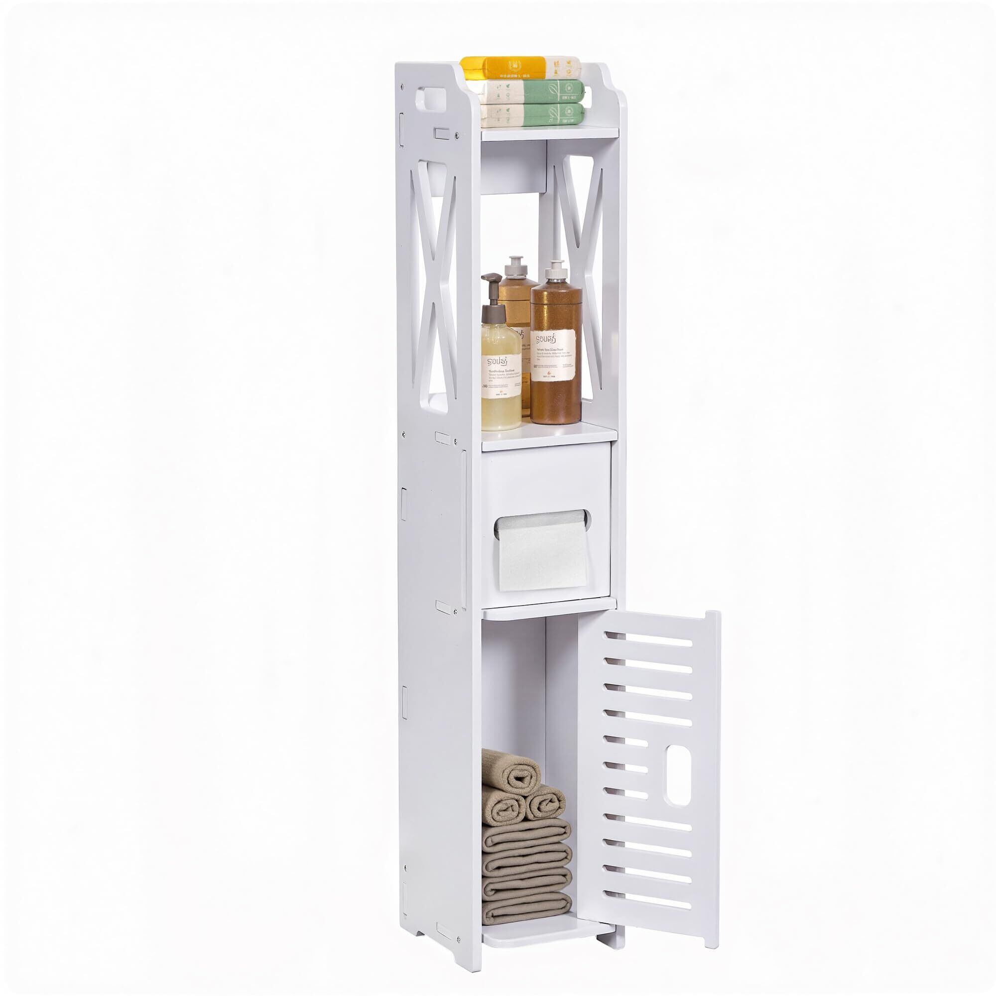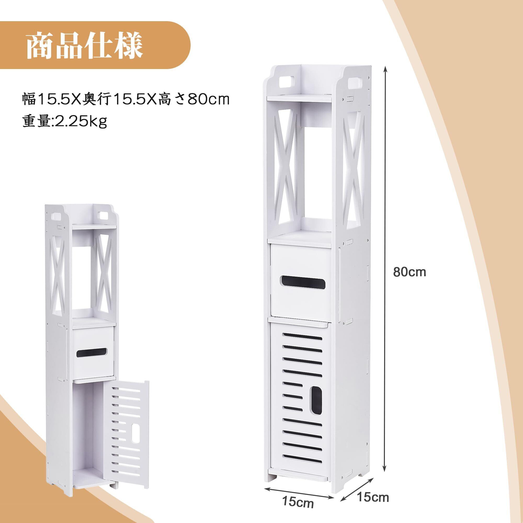 VECELO トイレ収納 トイレラック 隙間収納 幅15.5X奥行15.5X高さ80cm スリム 扉付き 組立簡単 ペーパーペーパー 省スペース 小物置き コンパクト 目隠し 安定感 トイレットティッシュ収納 コーナーラック 細長い 洗面所 浴室 玄関 バスルーム ホワイト