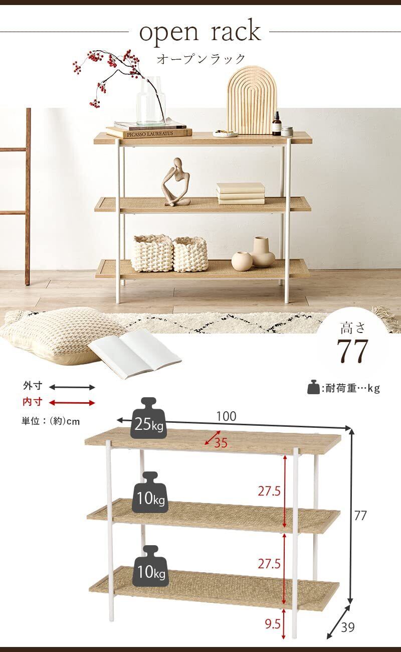 萩原 オープンラック テレビ台 テレビボード 頑丈3段 ラタン 籐 韓国風 インテリア 幅100 奥行39 高さ77 1台 ホワイト KR-3123NW