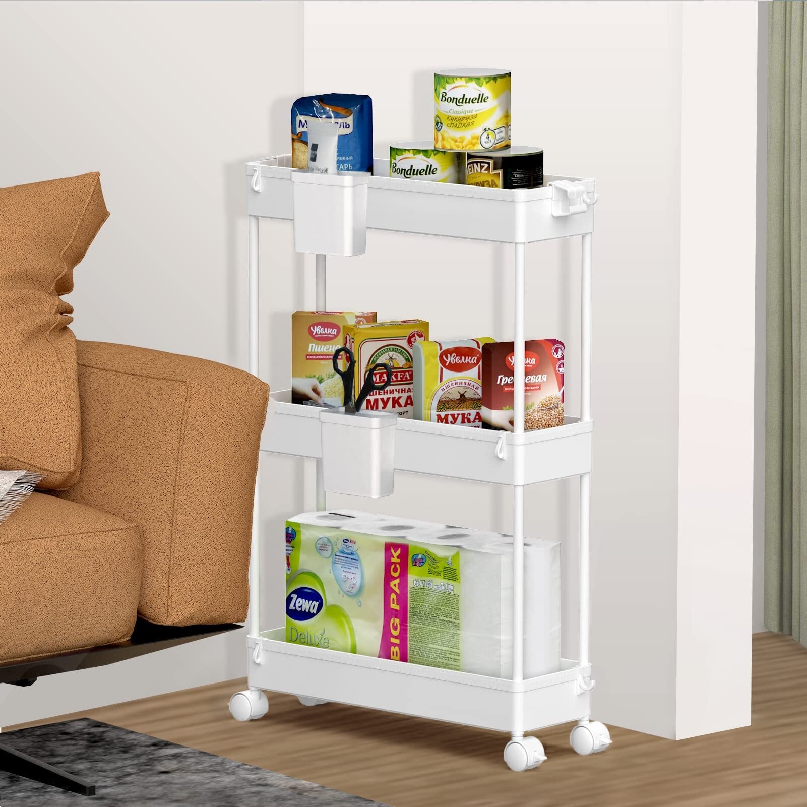 SPACEKEEPER キッチンワゴン 隙間収納 スリム 13cm 収納カップ 仕切板付き 多機能 小物 食品 調味料 キャスター付き 組立簡単 浴室 台所 冷蔵庫横 3段 ホワイト