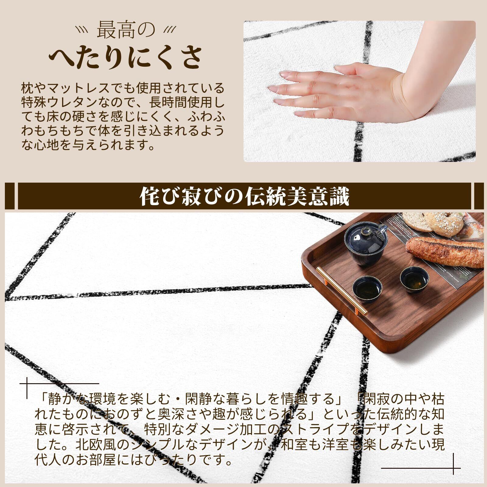 【伝統的な美意識】カーペットに特殊な模造ダメージ加工ストライプが施されており、シンプルで侘び寂びの美を強く感じさせ、優雅な雰囲気を演出してくれます。玄関、書斎、床暖房、キッチン、リビングルーム、スタディルーム、寝室、バスルーム、ダイニングルーム、廊下などの場所に最適です。