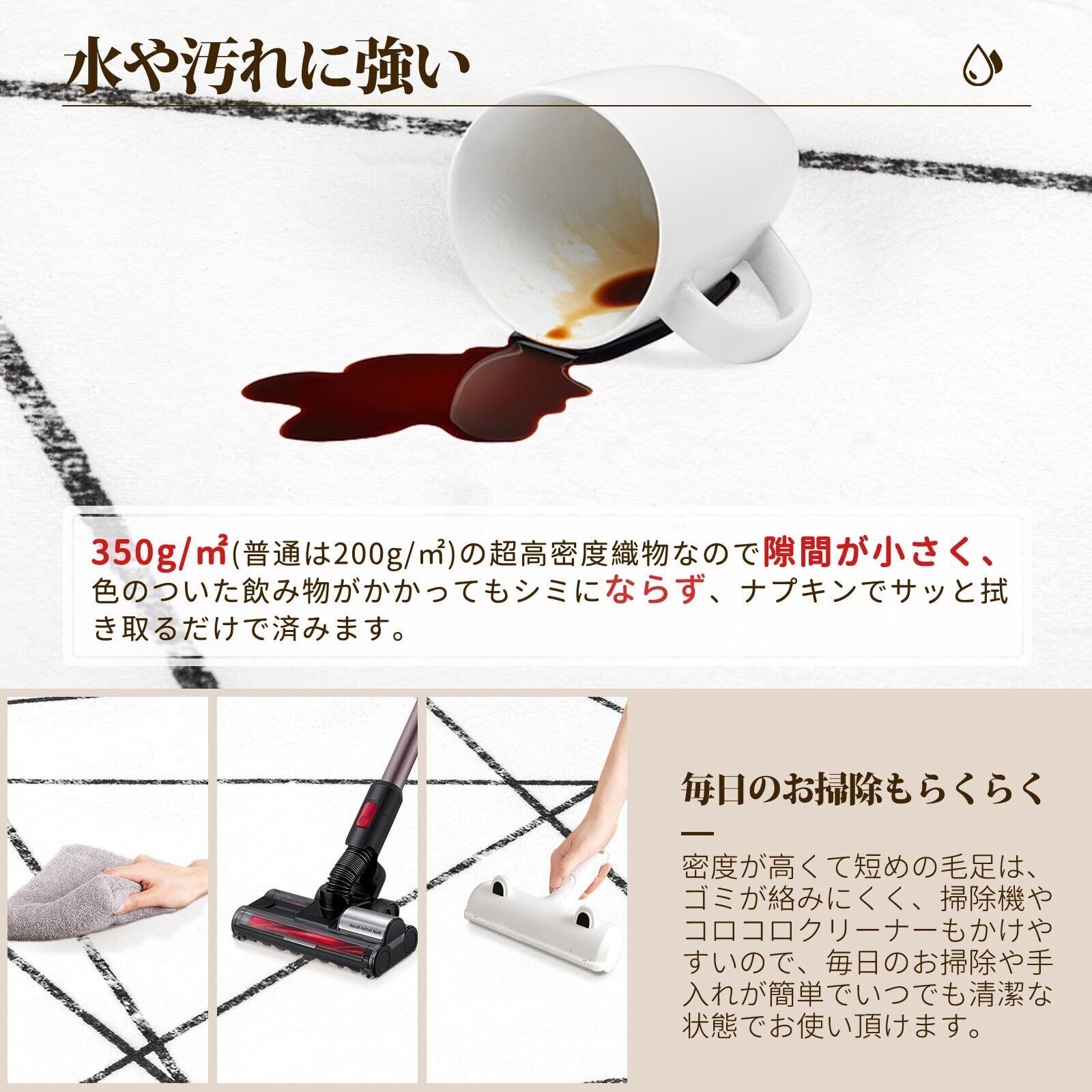 【品質】商品出荷前には日本国内にてしっかり検品を行っておりますので、ご安心ください。万が一カーペットに不具合がある場合は、1年間のが付いていますますので、お気軽に当店までご連絡ください。※お客様ご注意:商品輸送の際に折りたたんでお届けするため、開封時に折りジワ、歪み・寸法不足等の変形がありますが、一週間ほどご使用になれば、ゆっくりと回復します。製品サイズに個体差があるため表記サイズより1~3%の誤差がある場合がございます。