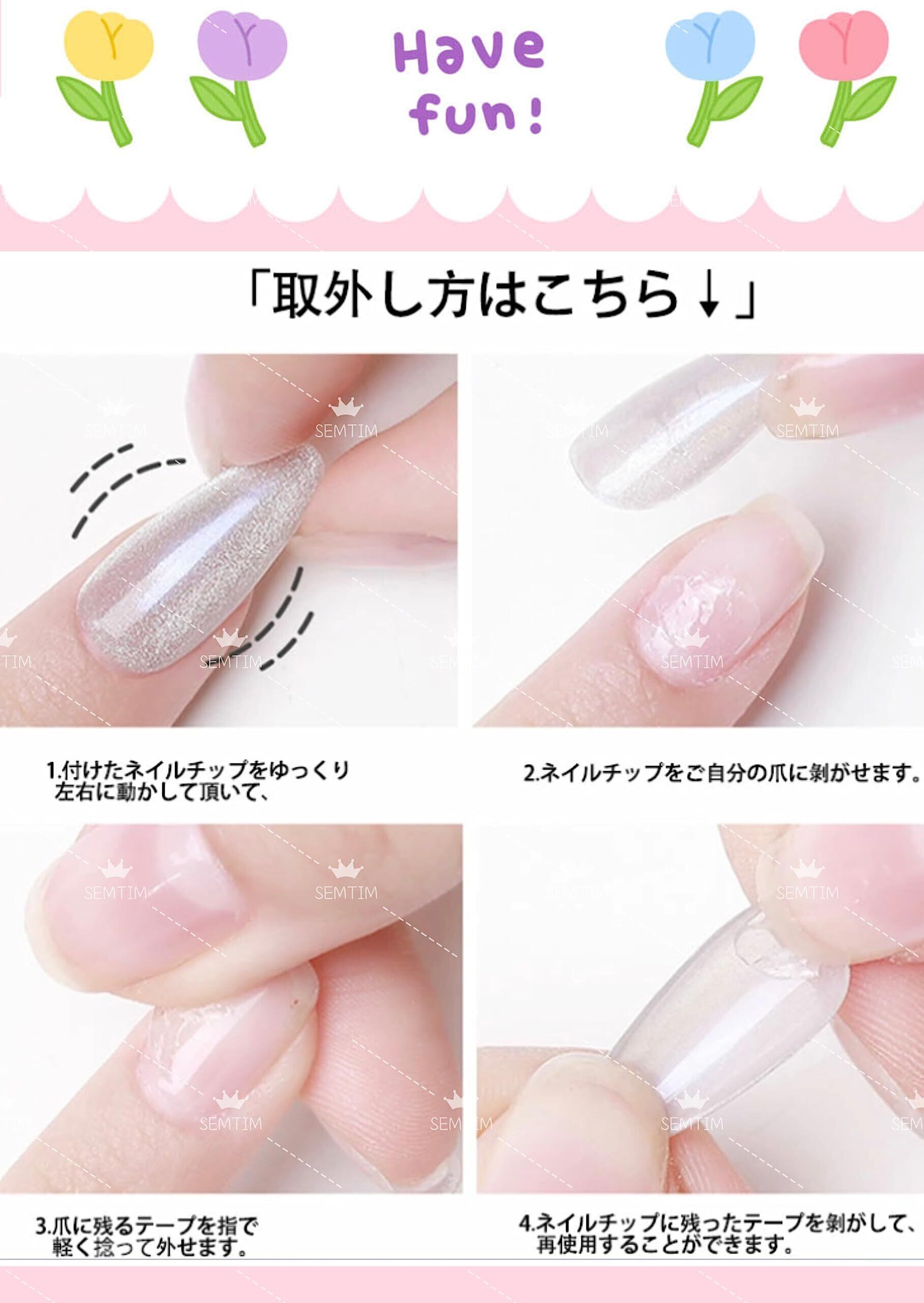 4.ご使用上の注意事項:油分や水分を拭き取らずに着けた場合、チップが剥がれやすくなります。隙間などがある場合、水などが入りやすく爪が変色する場合がございますのでご注意ください。