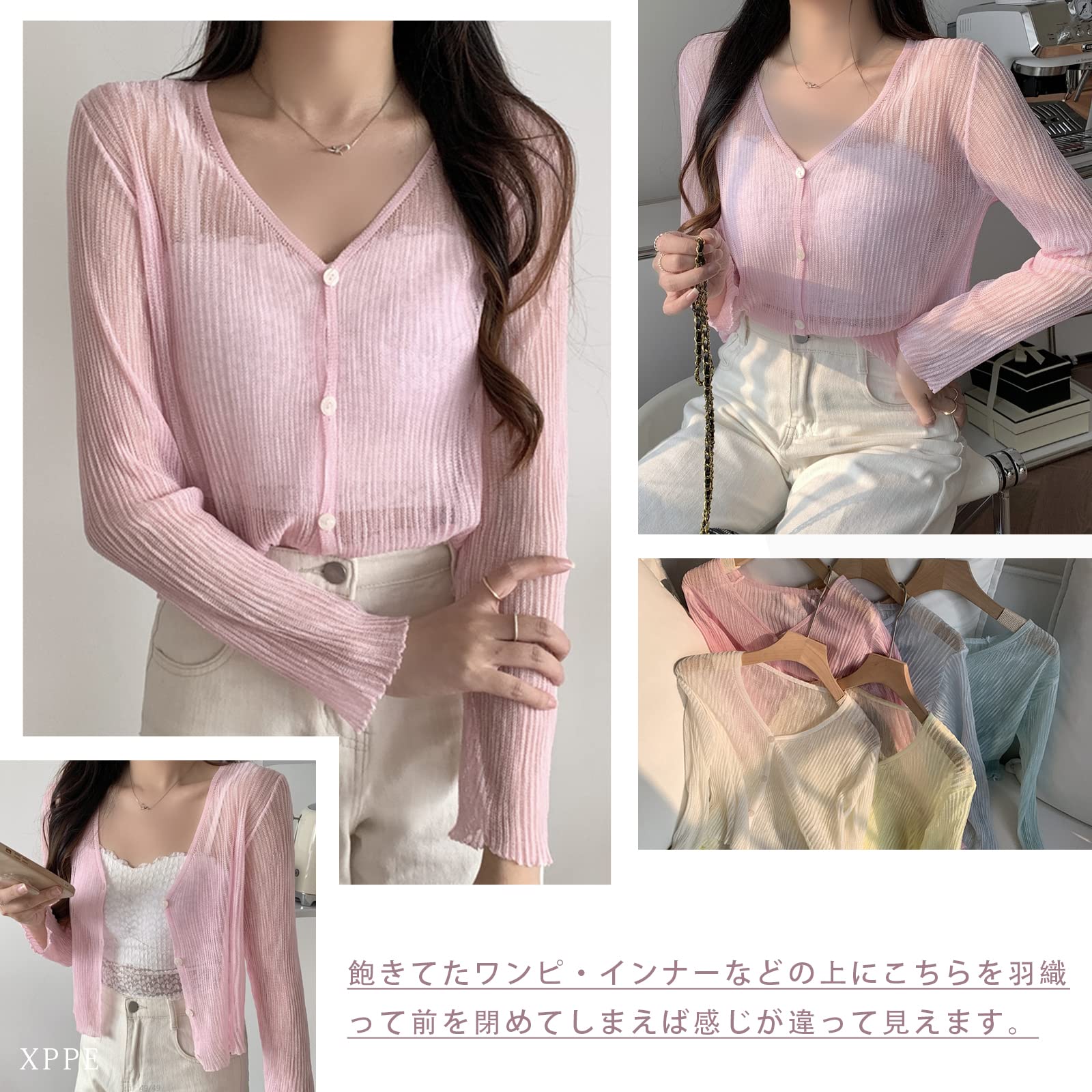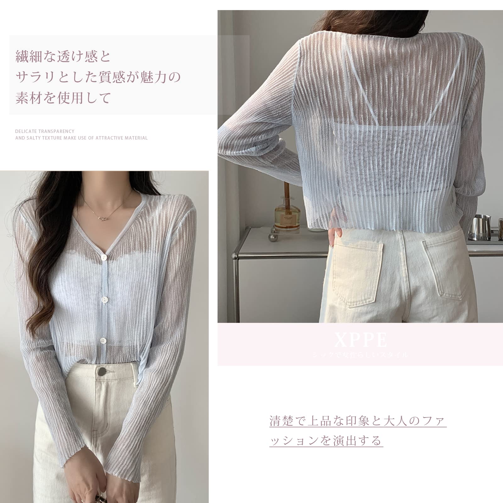 [xppe] カーディガン レディース 薄手 Vネック シースルー トップス ニット 冷房対策 UVカット 日焼け止め おしゃれ オフィス お出かけ 透け感 肌魅せ ショート丈 前開き きれいめ 上品 春 夏