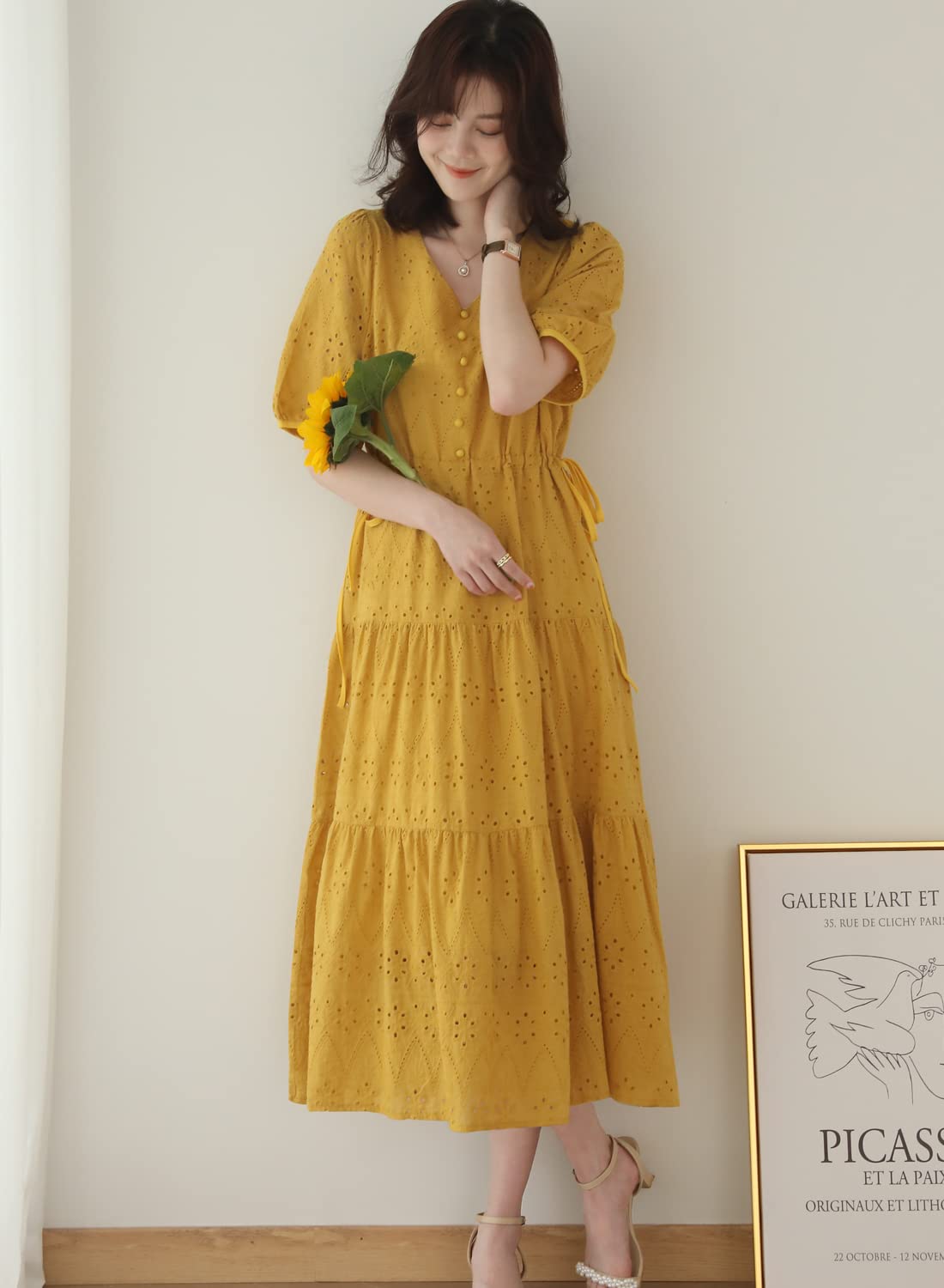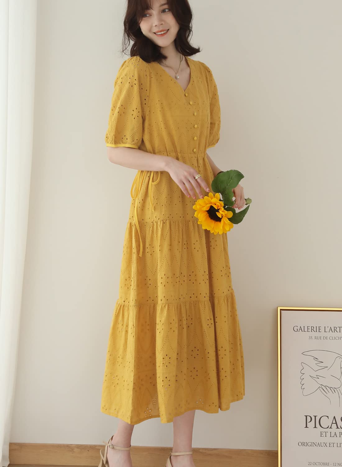 ●刺繍花レースが全身に展開されて、程よい甘めのフリルデザイン、コットン素材ならではのふんわり素材、ナチュラルフェミニンな雰囲気にしたいときの、おすすめ夏ワンピが今季に新登場しました! ハイウエストの両サイドにリボン付きで、ウエストサイズを調整できる同時に、スタイルが美しい印象も引き出します。歩く度にふわっと揺れ動く裾周りも涼し気で、シーズン感を高めてくれます。優しげな色調で女性らしいイメージを演出してくれるドレスです。