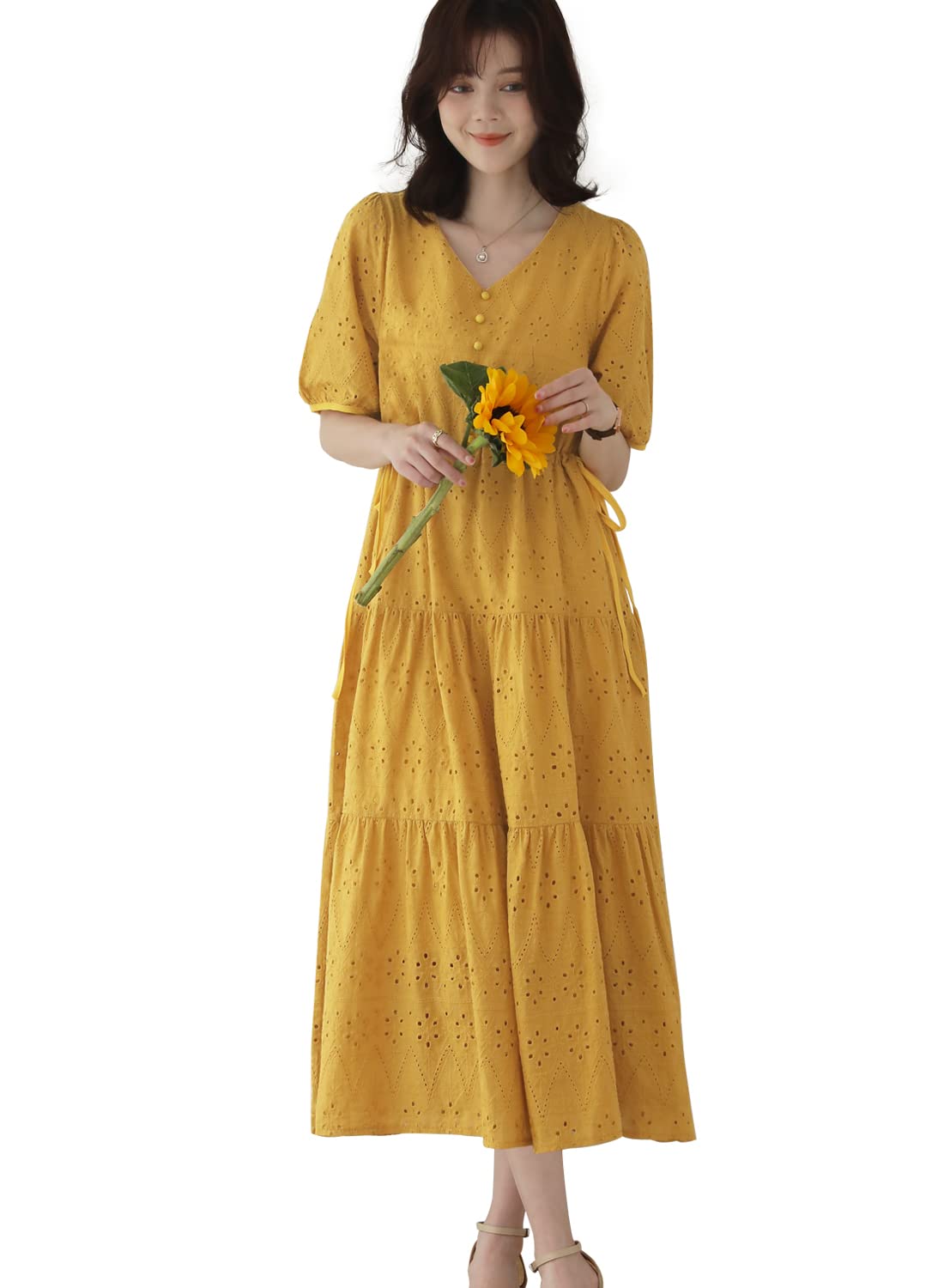 [Sueeya] スイーヤ ワンピース レディース ロング 刺繍 レース 半袖 フリル パフスリーブ ハイウエスト リボン 着痩せ 体型カバー おしゃれ Vネック 裏地付き 女子会 デート お出かけ 夏