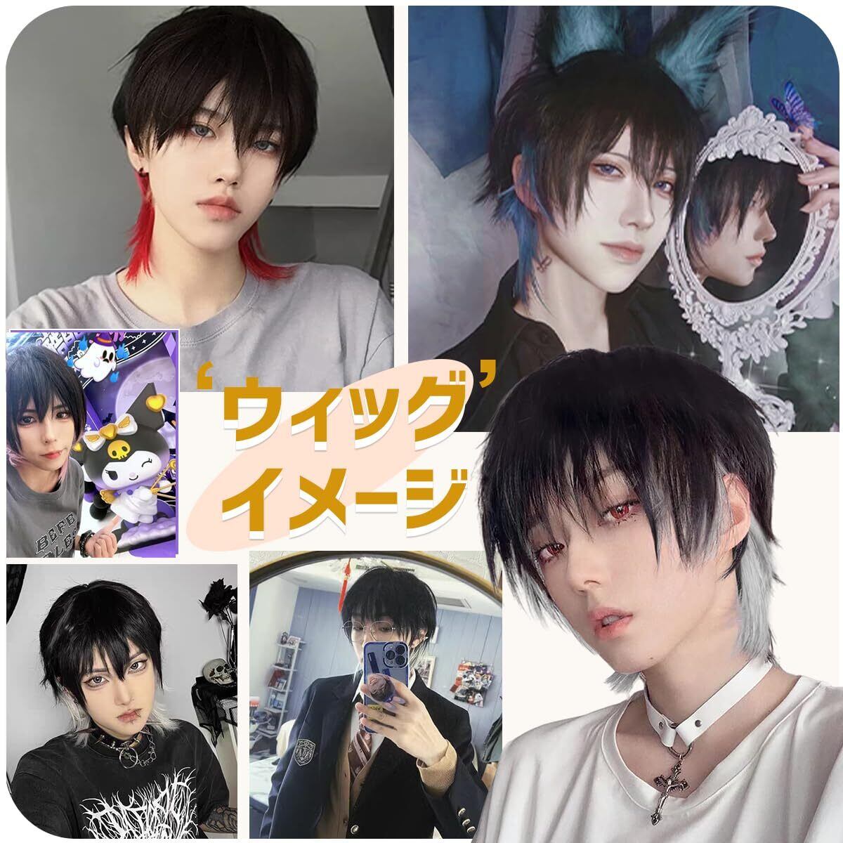 【商品情報】①インナーカラー:黒髪/ホワイト。インナーホワイト色で、清潔,純粋無垢な印象を与え、気軽にイメチェンでき。 ②タイプ:カジュアルショートインナーホワイトウルフウィッグ。 ③素材:耐熱ファイバー。160℃までコテ、アイロン使用OK。 ④裏側:バラメッシュネット。 良好な通気性と弾力のあるバンドを使用、着用し最適! ⑤アジャスター付き:フック式で、頭周りにあわせて段階調節可能(頭周り:約56~58 cm)。