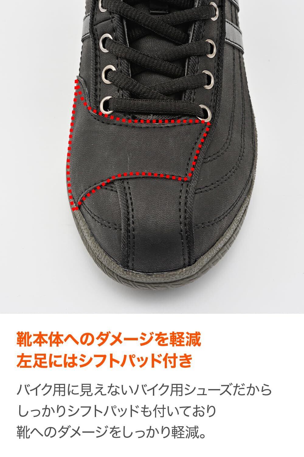 【仕様1】安全靴同等レベル(JIS規格S級相当)の耐衝撃性能を備えた鉄芯をシューズ先端部に内蔵することで、バイクと地面に挟まれた際の安全性を向上させました
