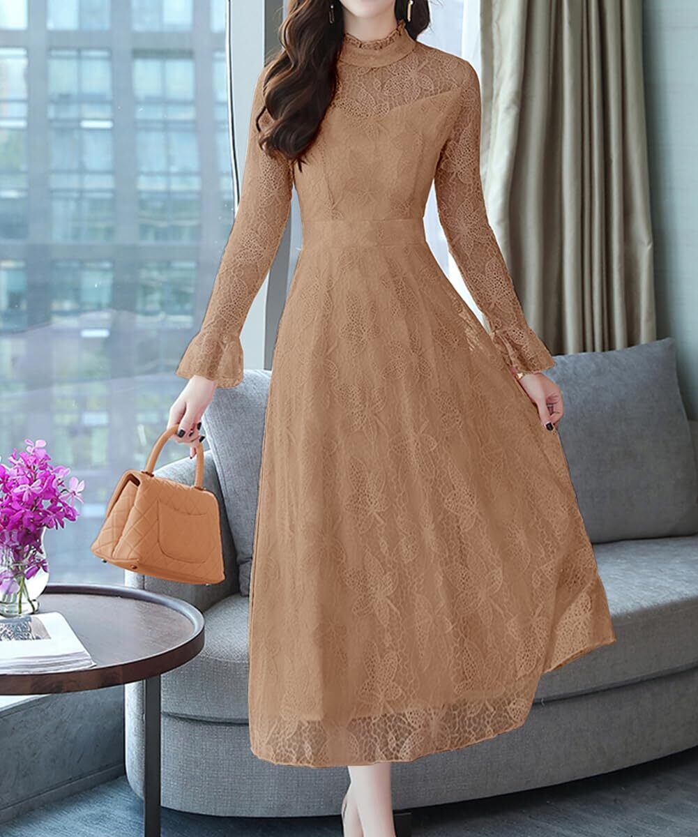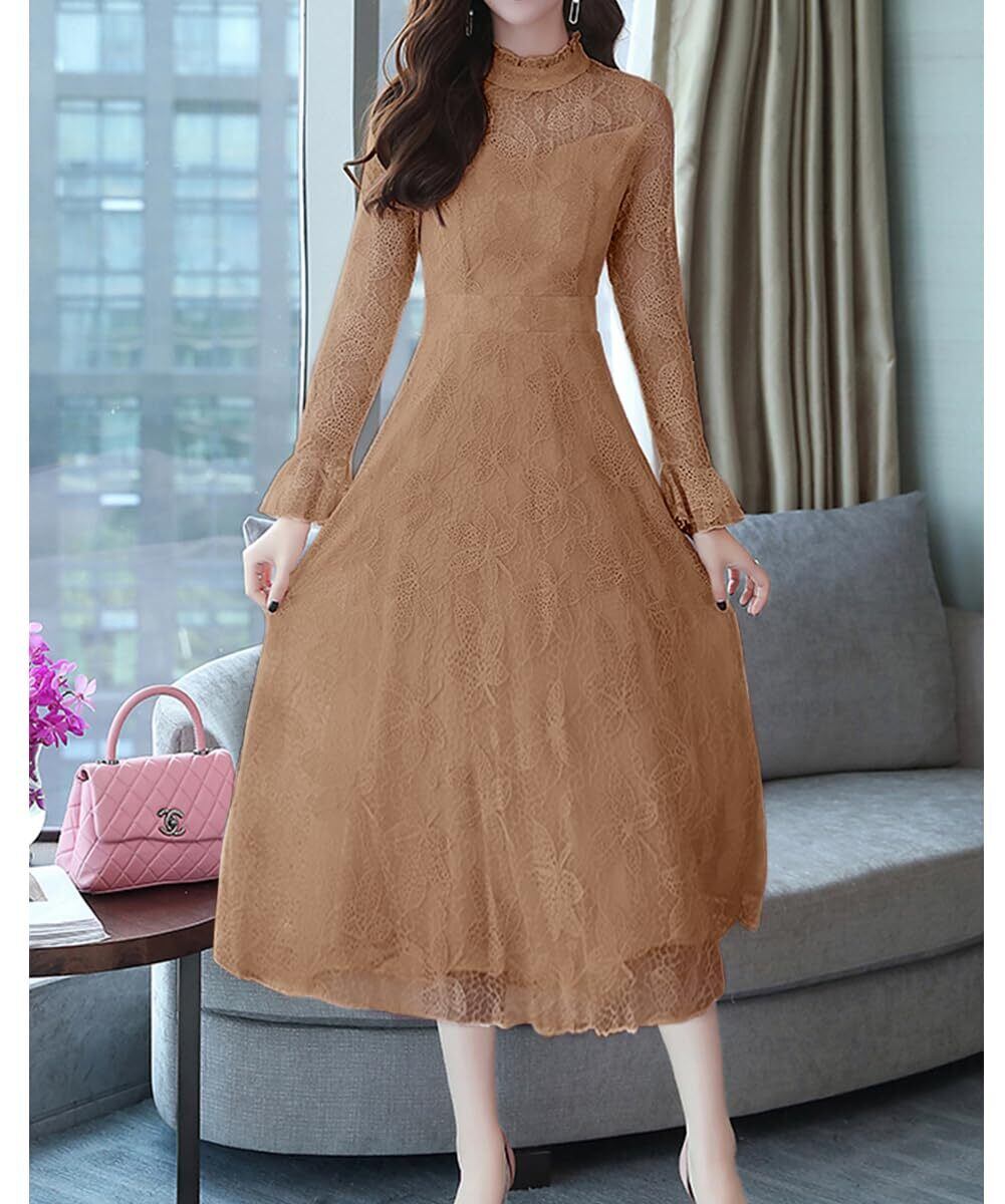 [Sueeya] (スイーヤ) ワンピース レディース レース ロング フリル ドレス 長袖 フレア 総柄 可愛い ハイウエスト 着痩せ おしゃれ シアー きれい 裏地付き パーティー 結婚式 通勤 二次会