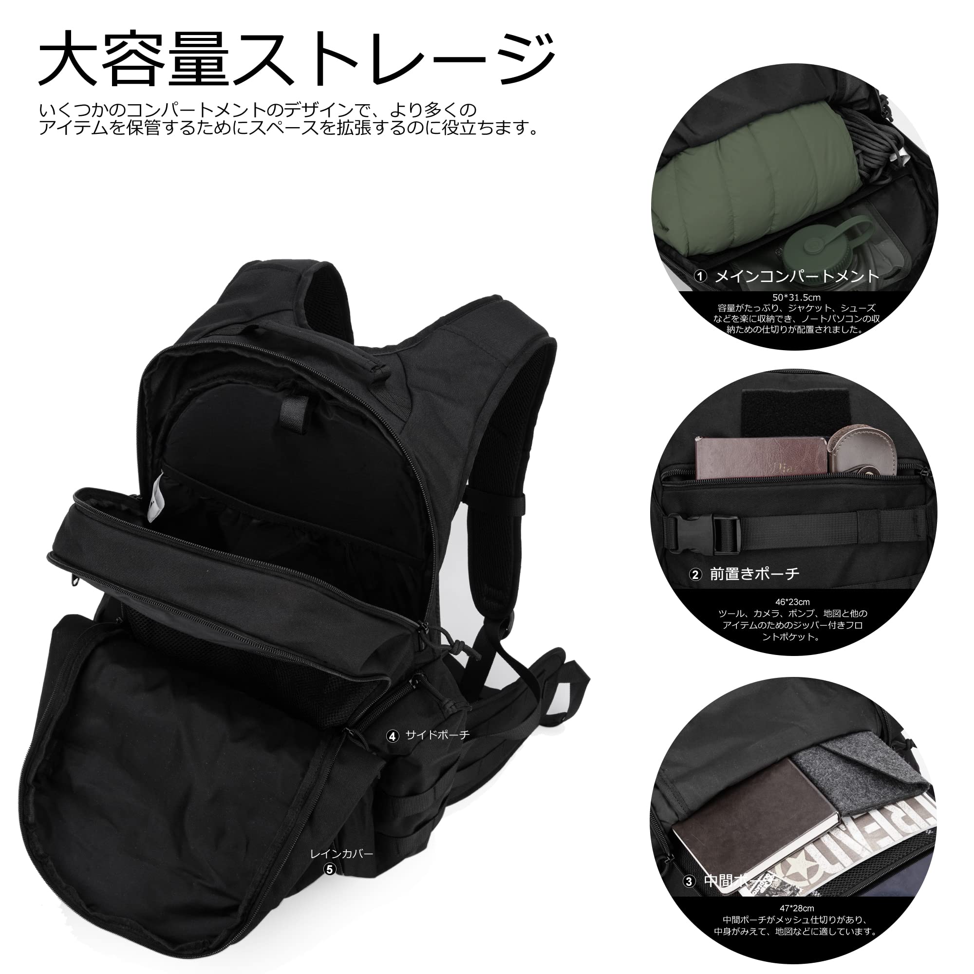 【MOLLE対応です】このリュックサックは、小さなアイテムに掛けたり、追加のポーチやギアを取り付けたりできます。 バックパックには、ベッドロール、テント、寝袋などを保持するためのバックルが付いた2つのウェビングストラップも付いています。