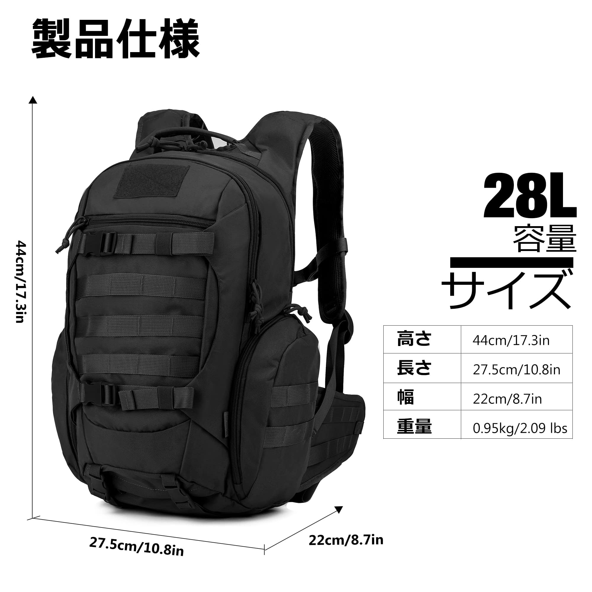 【リュックザック 仕様】容量:28 リットル。長さ27.5x高さ44x幅22cm。 このミリタリーバックパックは600Dポリエステル製です。 YKKジッパー。