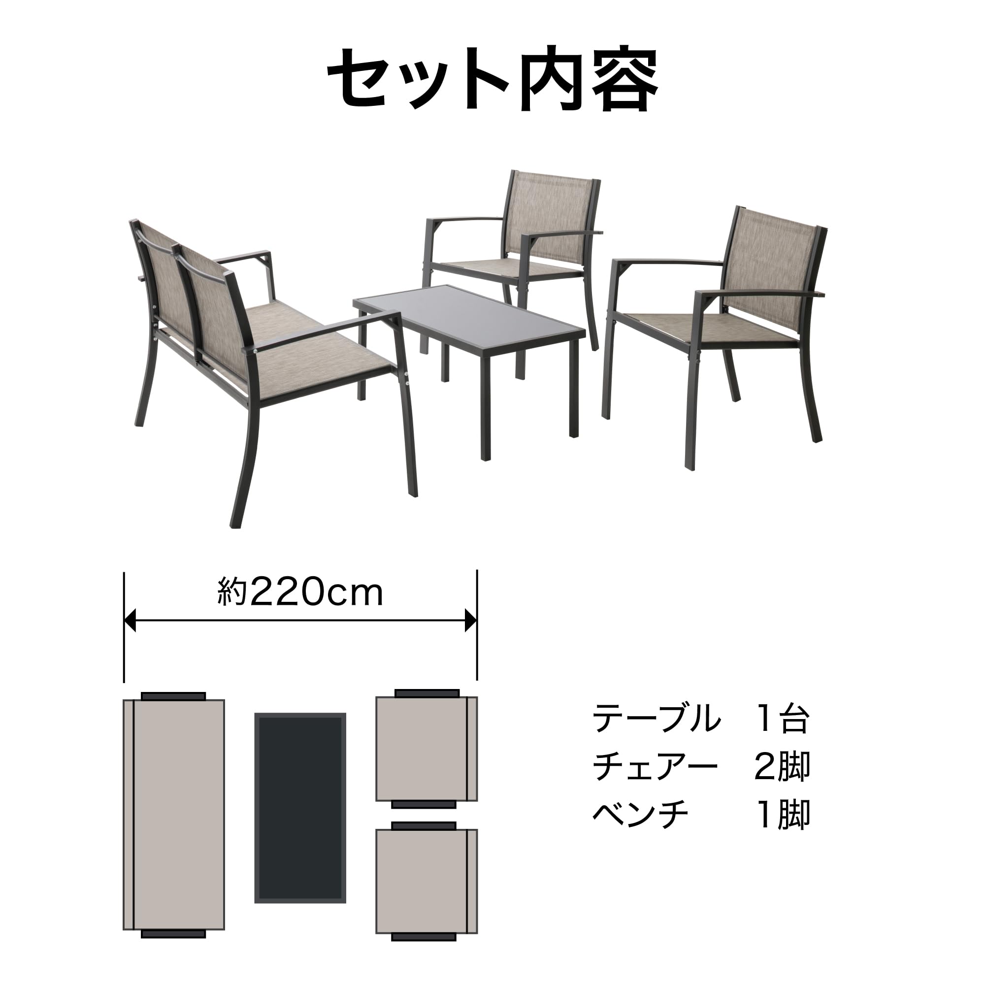 サイズ:テーブル:約幅84cm×奥行44cm×高さ38.5cm、チェアー:約幅58cm×奥行59cm×高さ75cm、ベンチ:約幅110cm×奥行59cm×高さ75cm