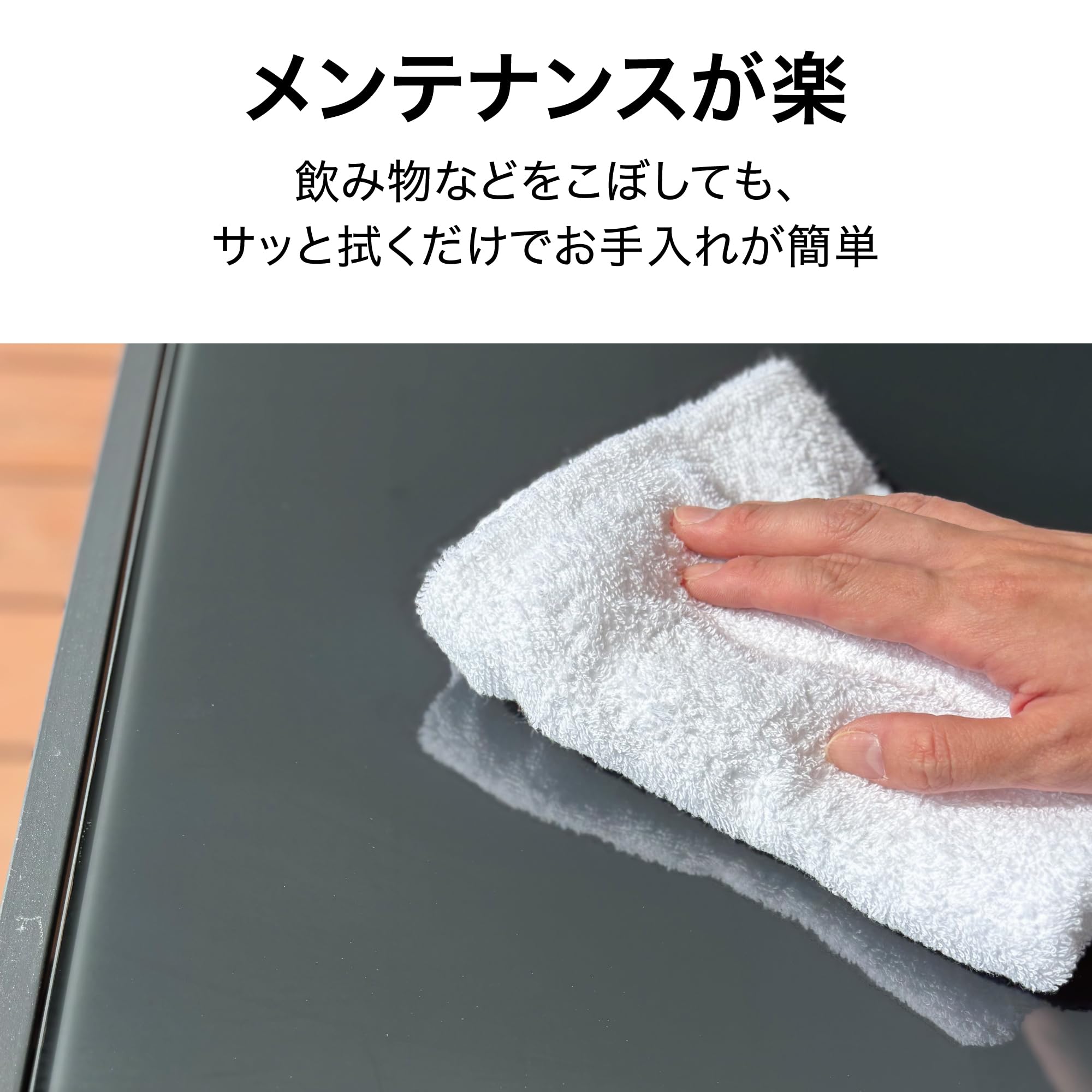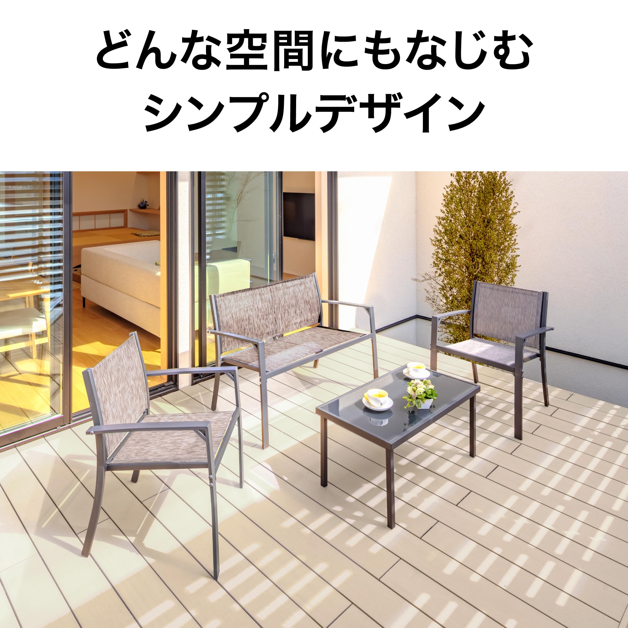 テラスでくつろぐテーブル&チェアー&ベンチの4点セット。どんな空間にもなじむシンプルなデザイン。大人4人がゆったりくつろげるサイズで家族で過ごしたり来客時にも活躍します。テーブル天板はブラックガラスで落ち着いたシックな印象です。飲み物などをこぼしてもサッと拭くだけでメンテナンスが簡単。チェアーはファブリック生地を使用しているので体がフィットしやすく、通気性の良い生地で快適な座り心地です。脚先は床を傷つけいにくいプラスチッククッション付き。