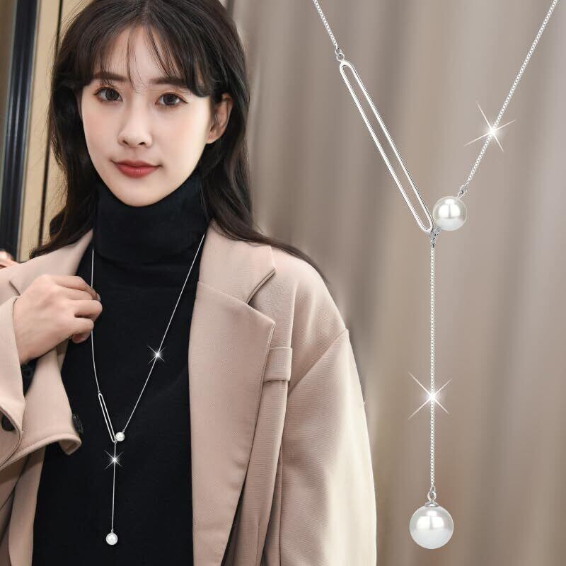 [UOUHAIO] ロング ネックレス レディース ファッション 女性用 長いネックレス Y字 キラキラ セーターチェーン スライド調整式 プレゼント 女性 アクセサリー ジュエリー (シルバー パール)