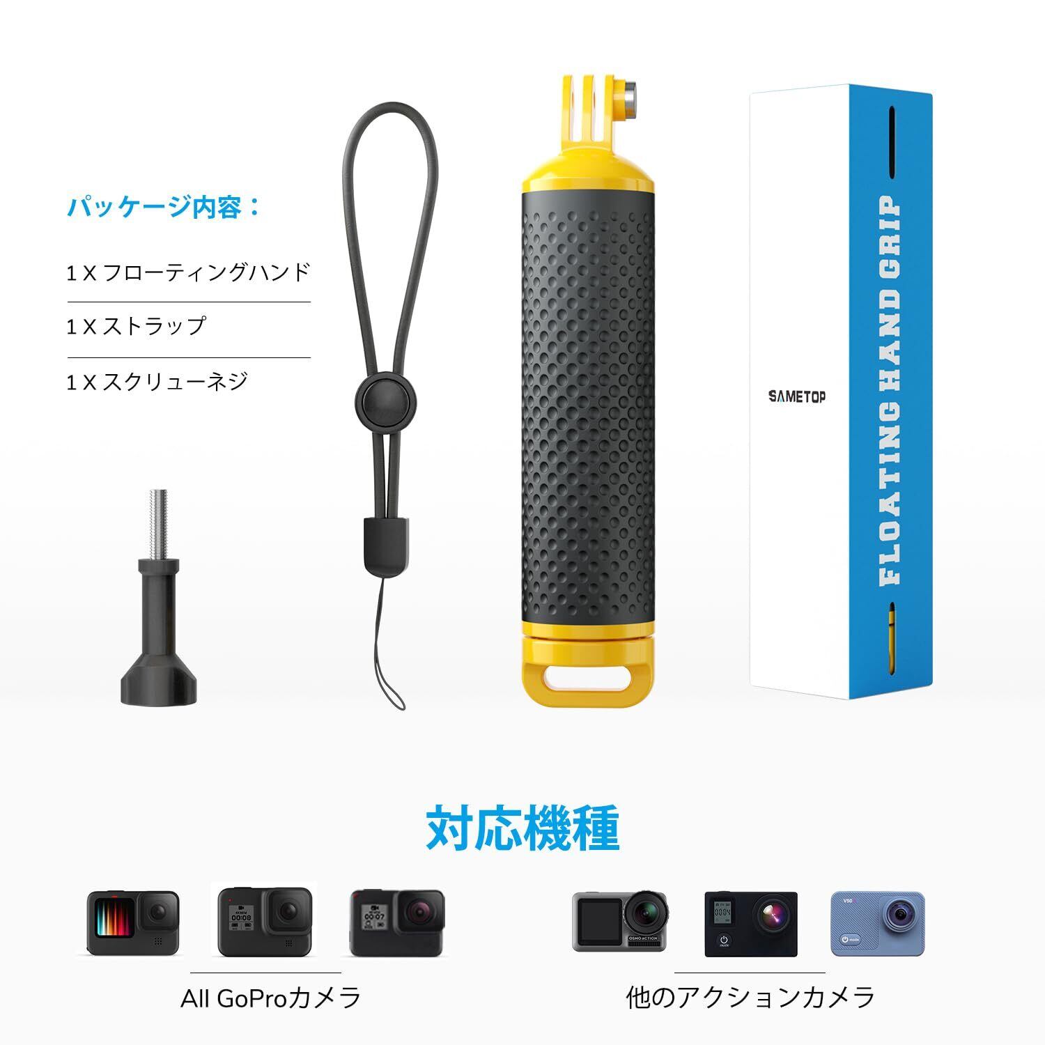 【Sametop】フローティング ハンド グリップ GoPro用 浮きハンドラー ダイビング用 Hero 12 11 10 9 8 7 6 5 4 Session 3+ 3 2 1 Hero (2018) Fusion カメラに適用(イエロー)