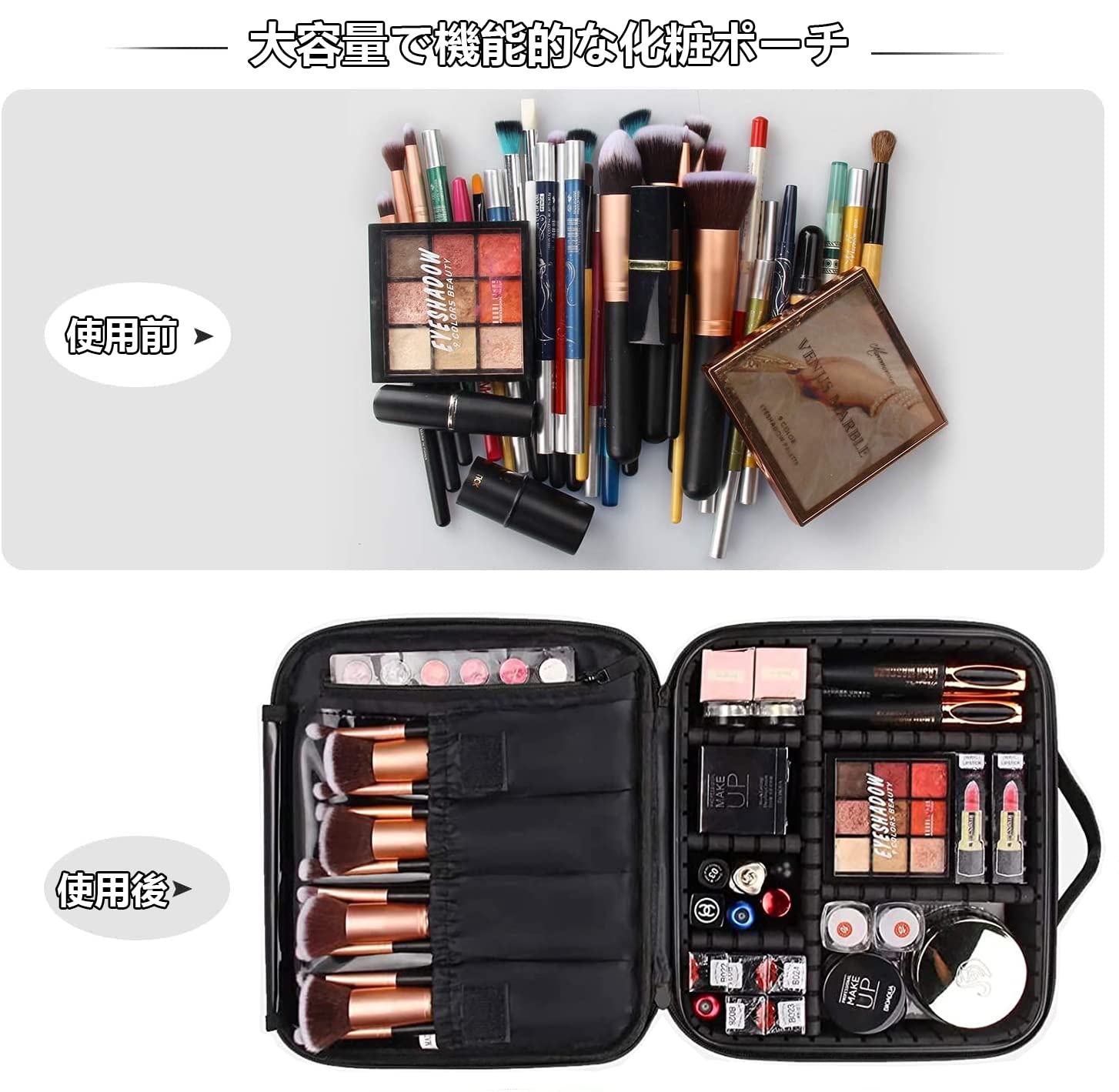 【優れた収納力】この大容量メイク収納ボックスは2つの部分で構成されているため。化粧ポーチ内のメイクブラシ収納ポケットは、伸縮性のある設計となっており、様々な形、サイズのメイクブラシを収納することができます。PVCカバーもついてあるので、ブラシとバッグを隔ててメイクブラシの汚れがバッグにつくのが防ぎます。下段に仕切りが付いて、化粧品(口紅、リップグロス、メイクブラシ、チーク、アイブロウ、アイシャドウ、美容グッズ)を合理的に収納します。
