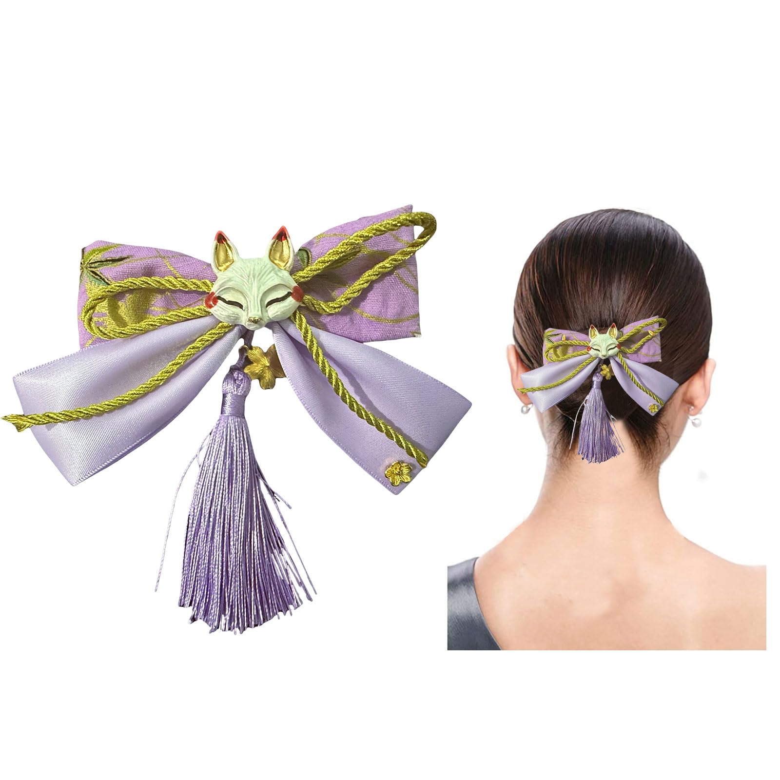 【素材&サイズ】髪飾りには高品質のポリエステルと金属ピンを採用し、リボンは幅約13 cm、長さ約8 cm。狐の面のサイズは約3cm*3cmです。5色