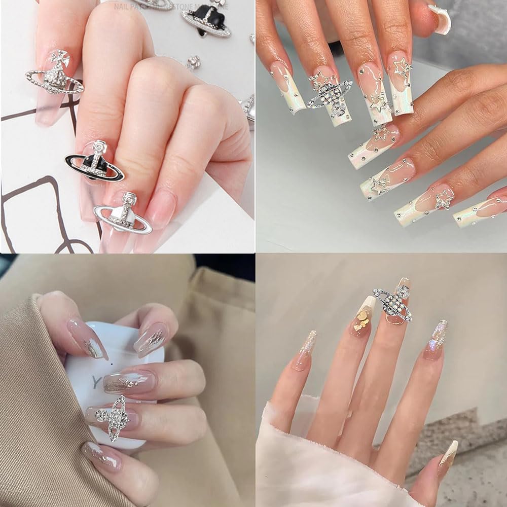 【パッケージ内容】ネイルパーツ約32個セット。十字架、ハート、惑星、真珠など8種類のデザインがあり、各種類4個ずつ。