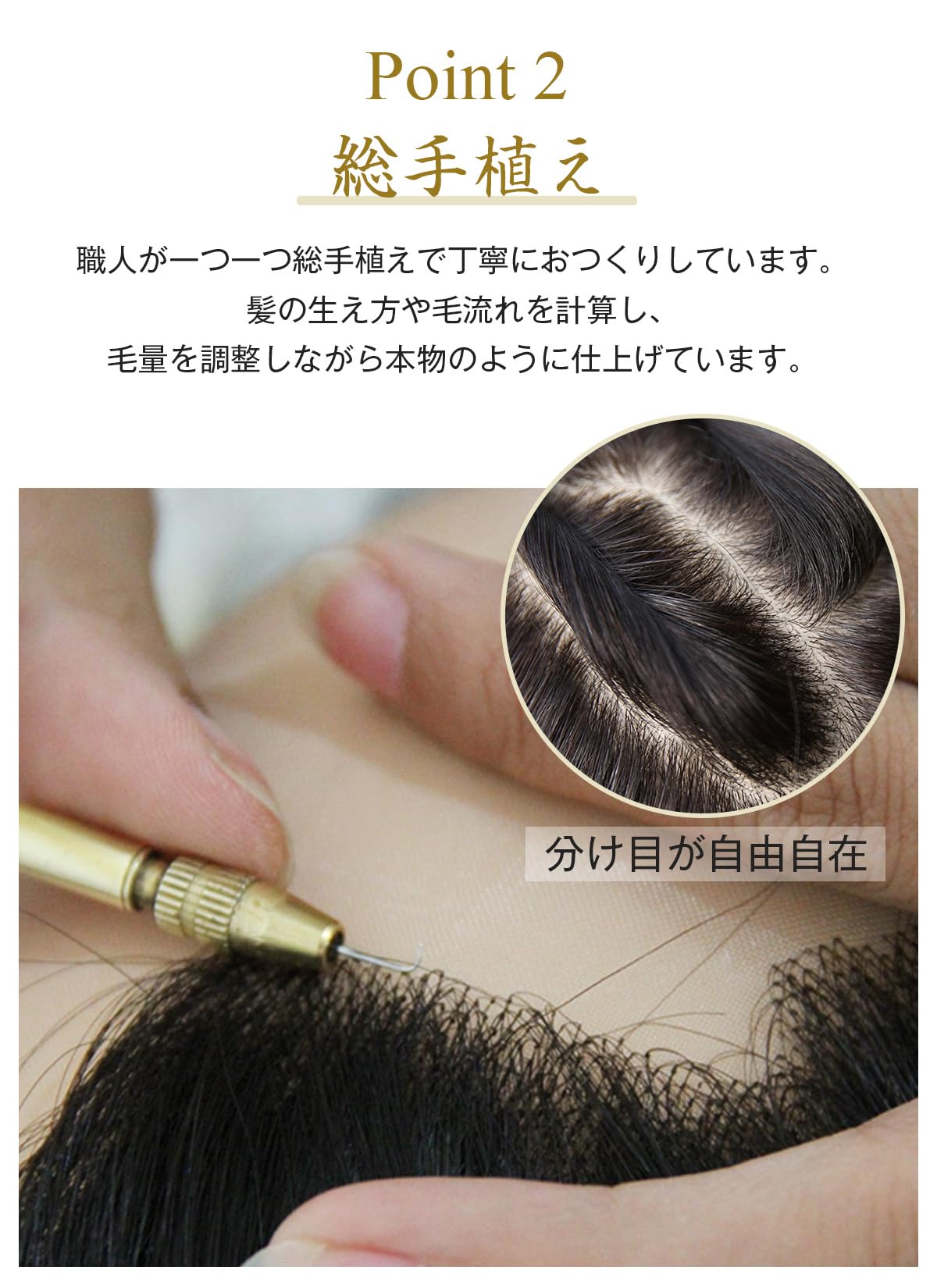 総手植え:職人が髪の毛を一本ずつ手作業で植え付けることにより、髪の流れやボリュームが非常に自然になります。特に髪の生え際は手作業で丁寧に仕上げられており、他の人が見てもその部分が自然に映り、ウィッグであることが気づかれにくいデザインです。