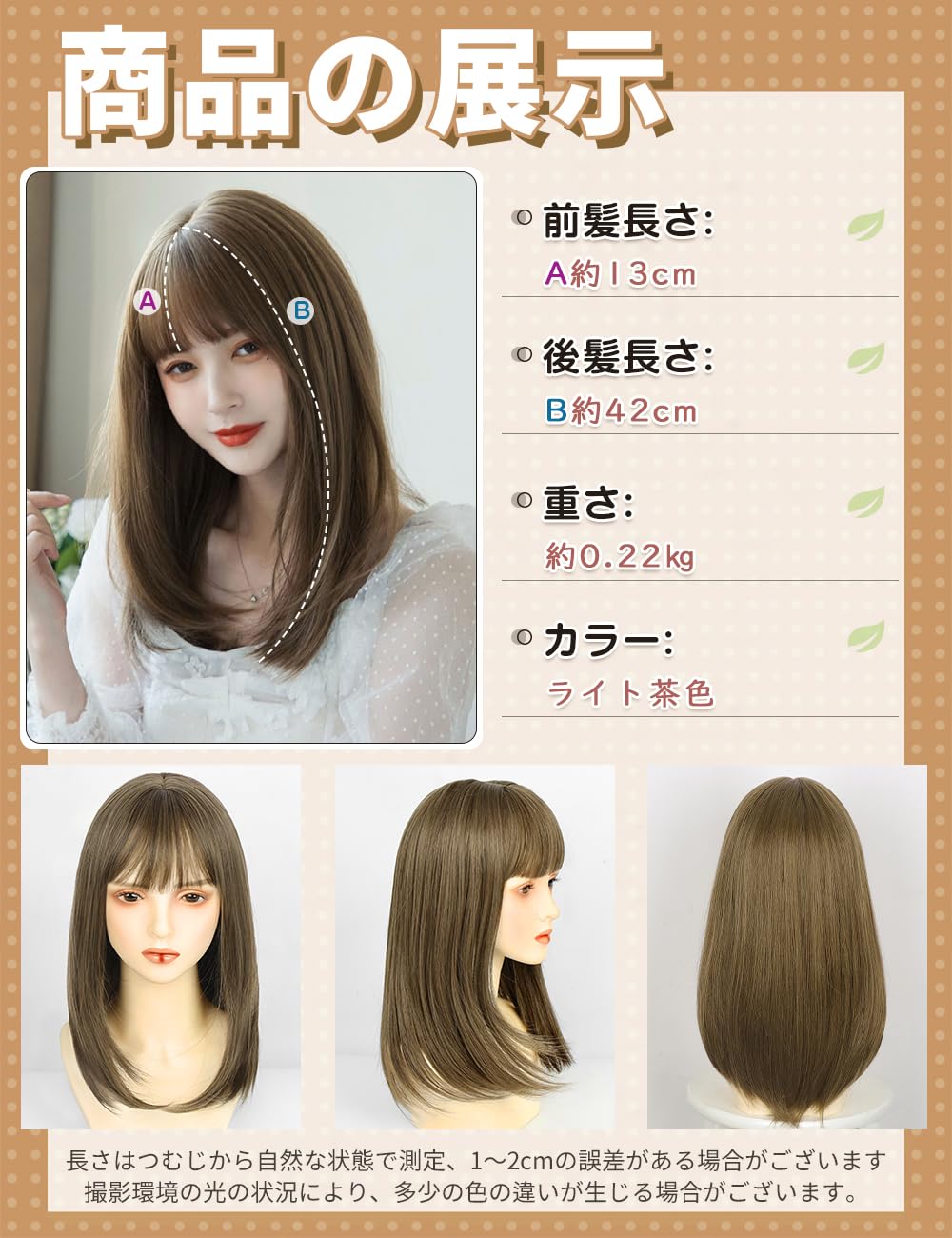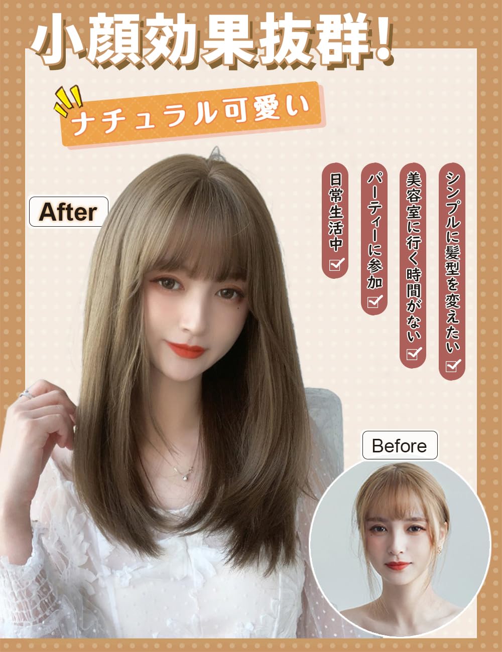 【ご注意】: ①カラー:ご使用のパソコンのモニター設定や部屋の照明により、実際の商品と若干色味が異なる場合があります。②前髪:それぞれの人に合った長さにデザインされており、好みに合わせてカットすることができます。③ケア:静電気や絡まる場合は柔軟剤やトリートメントでケアすれば大丈夫です。