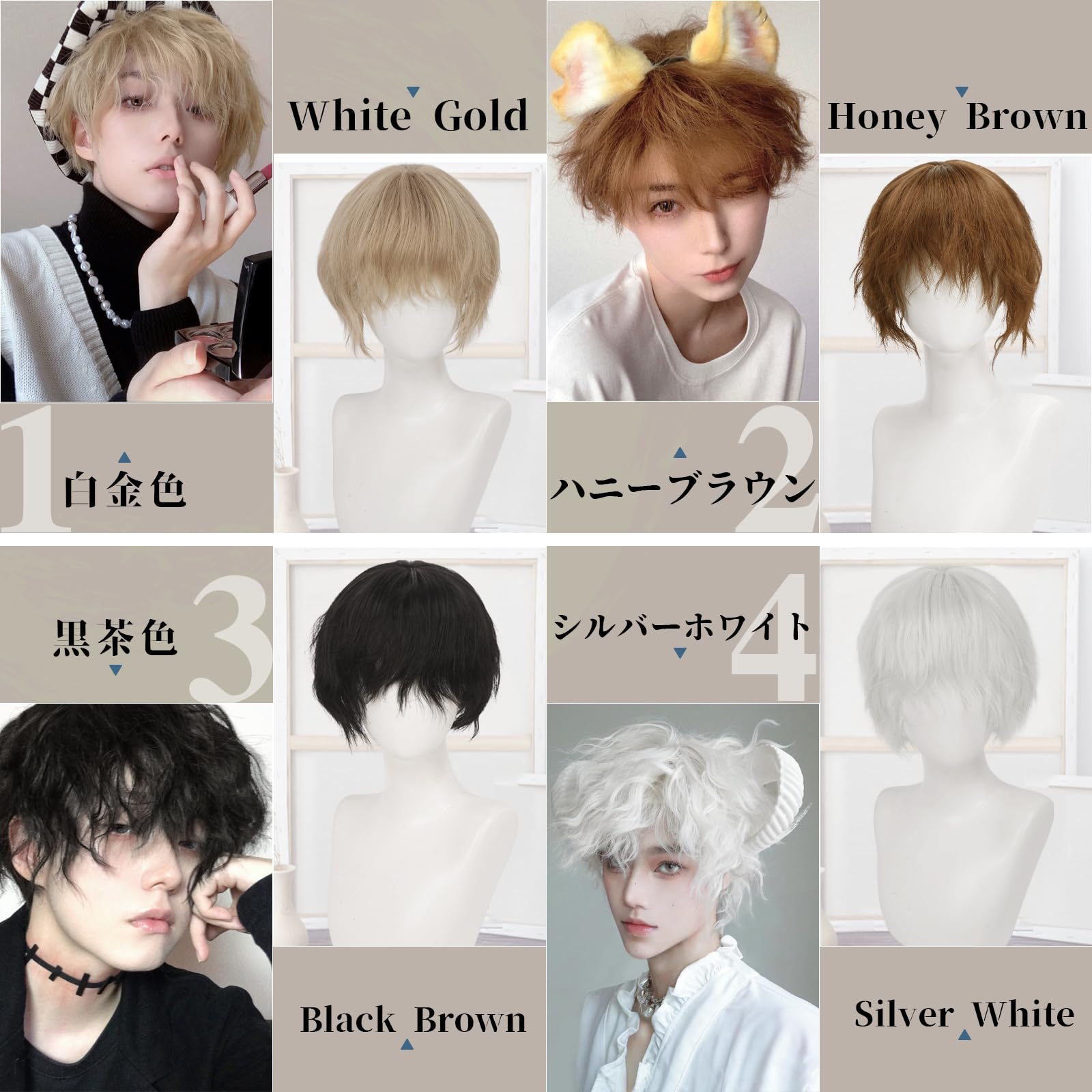 ❀デイリーカラー:①黒茶色②白金色③ハニーブラウン④シルバーホワイト。デイリーカラーのコレクション!日本の男性に人気のデイリーカラーを集めました!学生でも大げさでなく着こなせます!Hawkkoのカラーの中でメンズウィッグの魅力を引き出す単色を選びましたので、同じスタイルでもまったく違う印象になります!※(商品の色味は出来るだけ現物に近い色を再現するように努めておりますが、撮影環境やモニター環境により色の見え方に差異がございます。予めご了承ください。)
