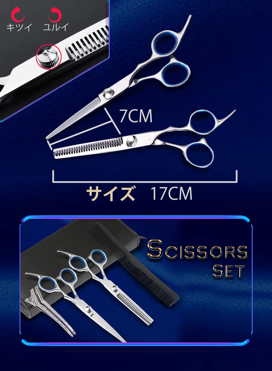 豊富な付属品 カットシザー、 セニングシザー、革製ケース、コーム(くし)クリップ