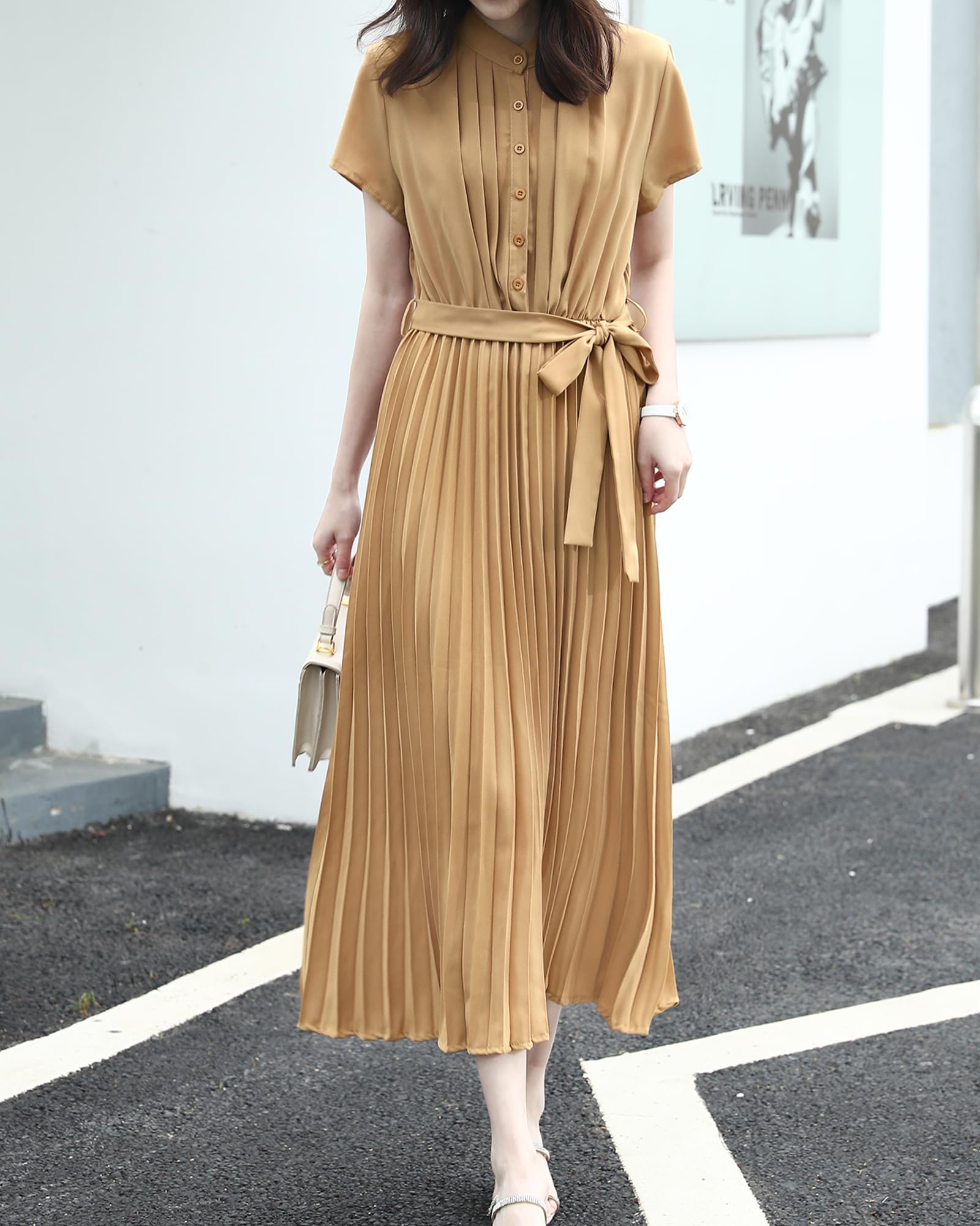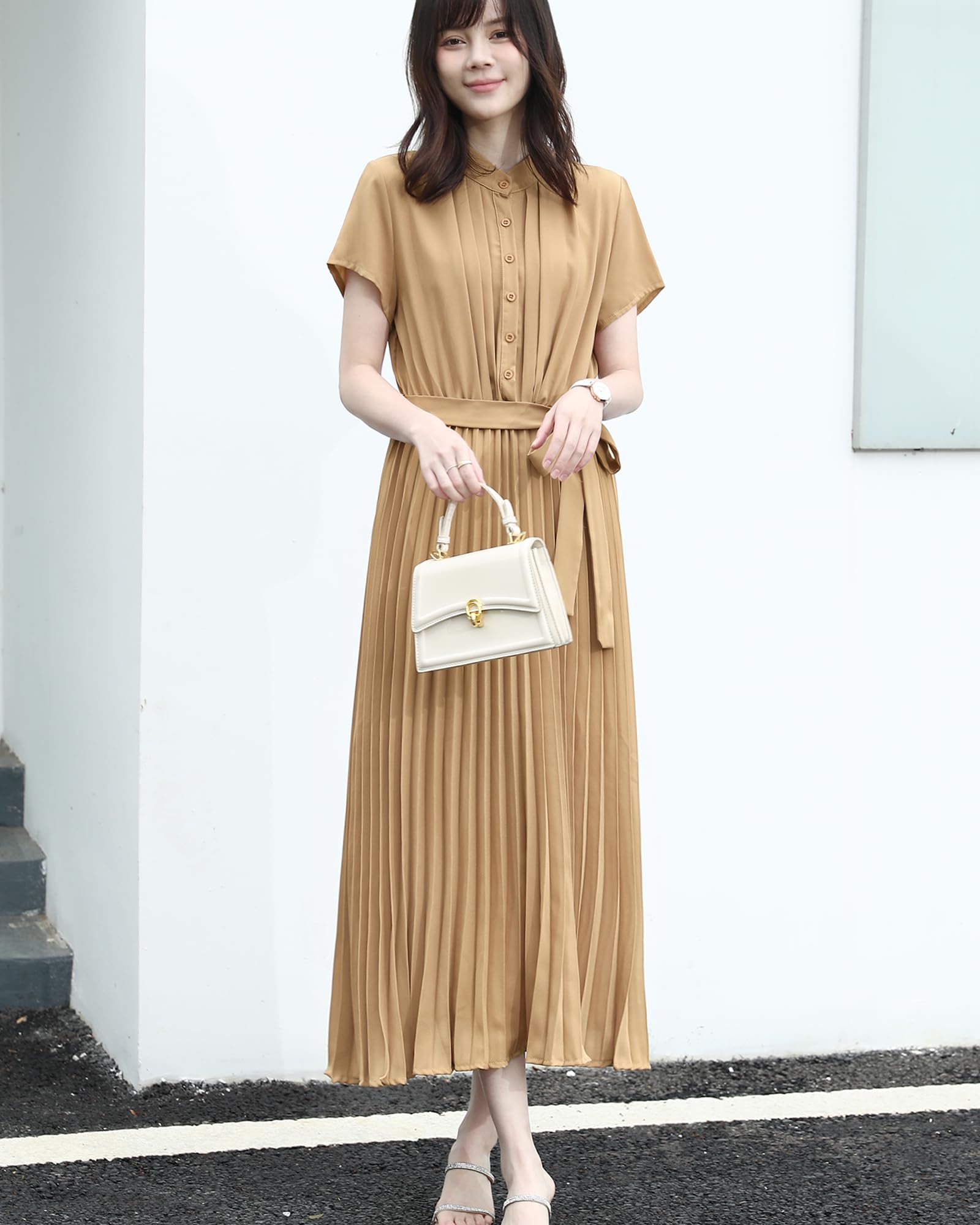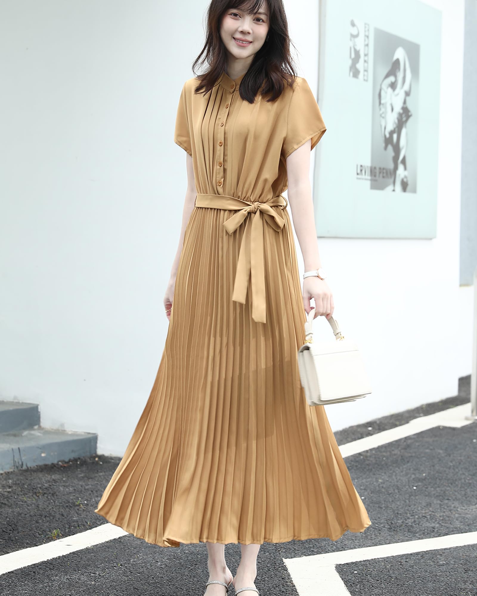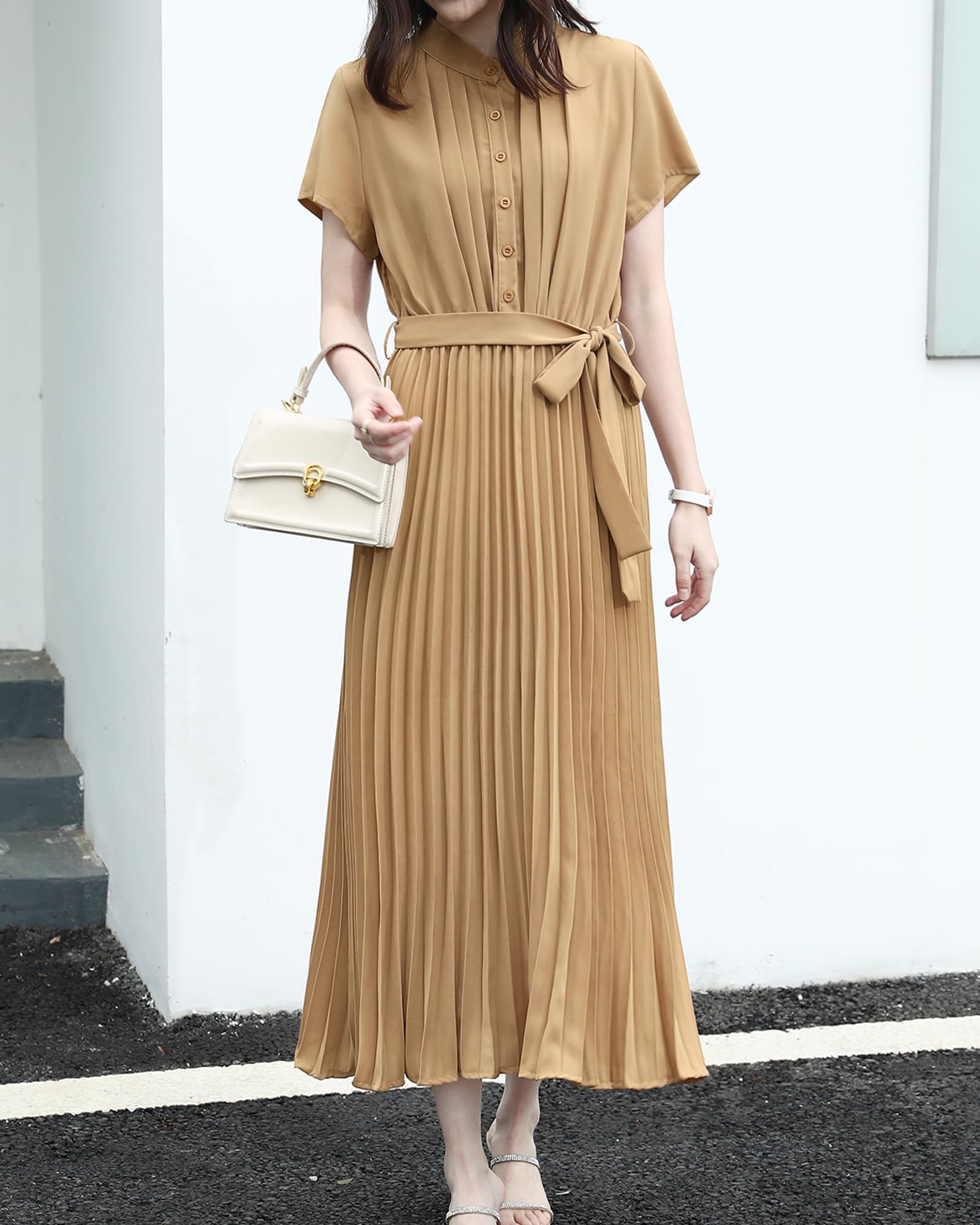 [Sueeya] スイーヤ ロング ワンピース プリーツ レディース ノースリーブ シャツワンピース ウエストゴム リボン タック 可愛い 着痩せ おしゃれ エレガント 通勤 結婚式 パーティー ドレス 夏