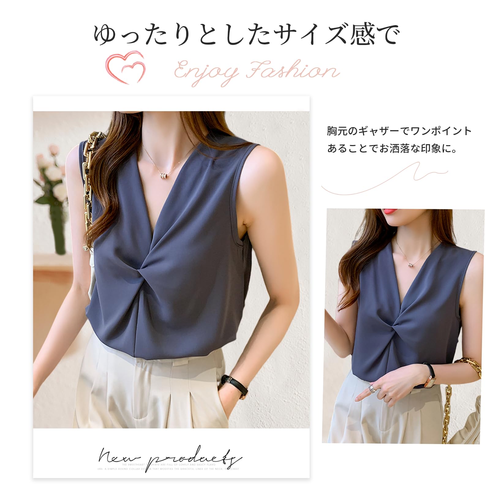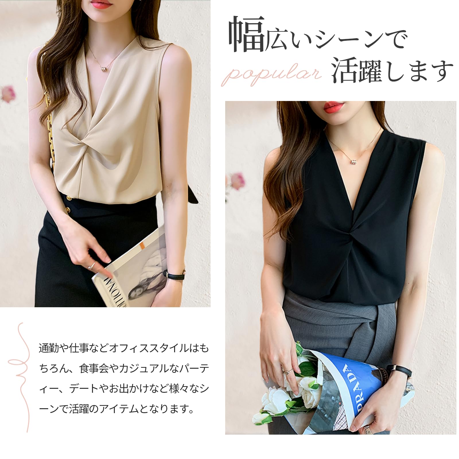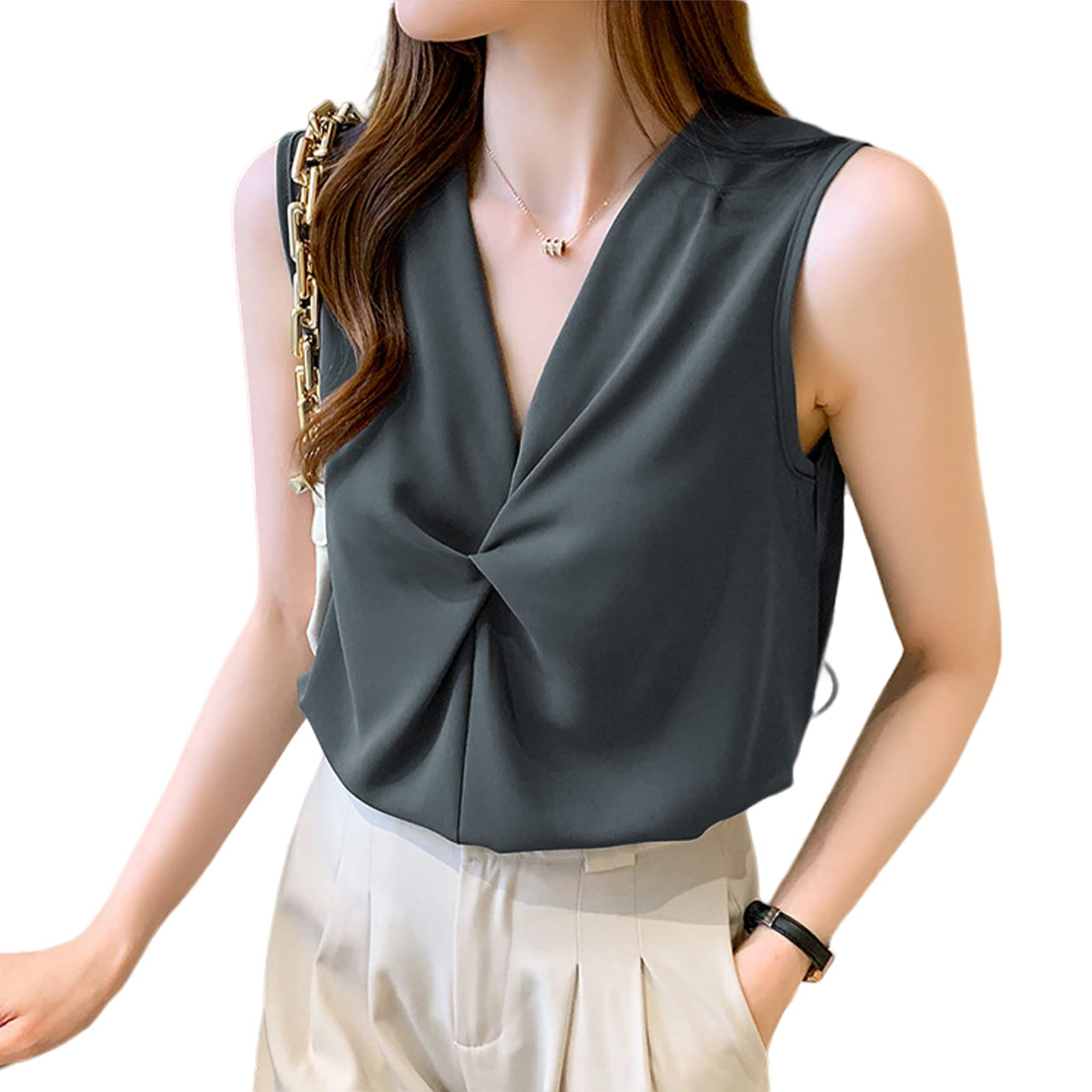 【エレガントな印象を与えます】クロスデザインの胸元が魅力的なレディースVネック無袖シャツです。女性らしい曲線を強調し、韓国風のデザインでエレガントな印象を与えます。シンプルでありながら、洗練された雰囲気を持ち合わせているため、多くの方にご利用いただけます。